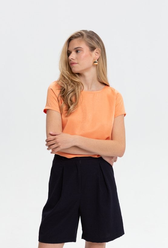 Bluzka damska wykonana z miękkiej, wiskozowej tkaniny. Bluzka z krótkimi rękawami oraz okrągłym dekoltem. Idealnie sprawdzi się jako baza do stworzenia codziennych, letnich stylizacji. Modelka na zdjęciu ma 174 cm wzrostu i prezentuje rozmiar 36.