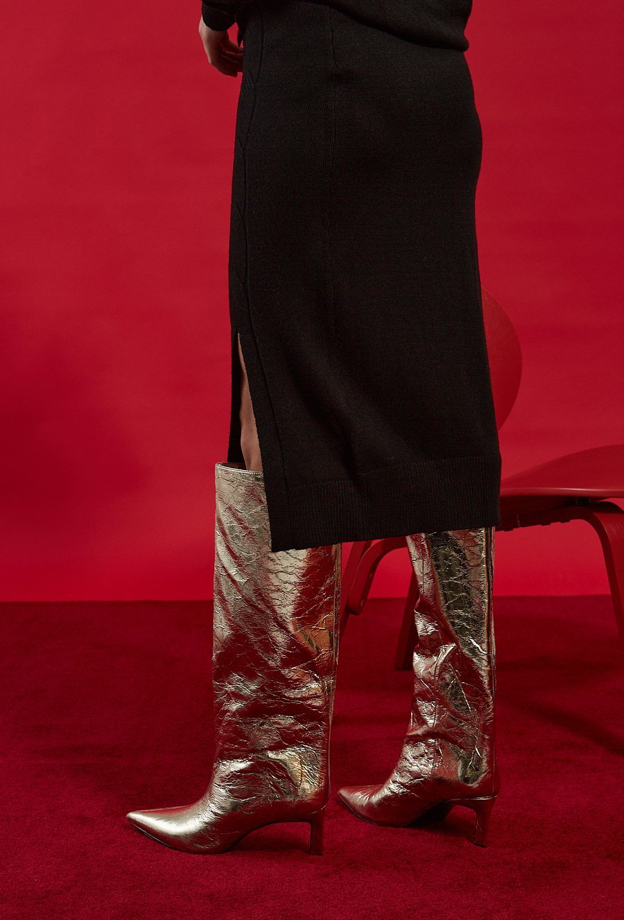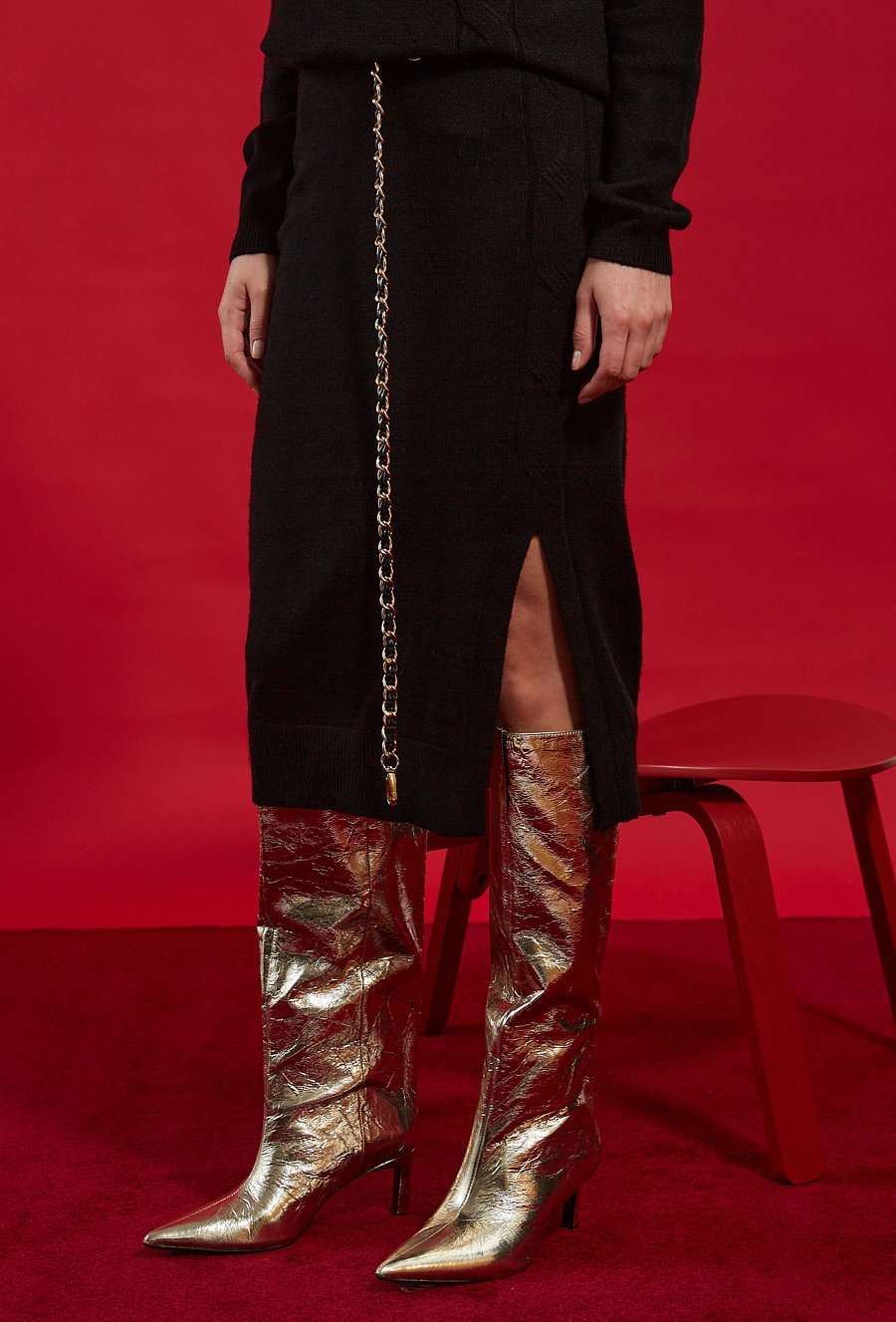 Dopasowana spódnica wykonany z miękkiej dzianiny na bazie wiskozy z ozdobnym warkoczem. Ma klasyczny czarny kolor, który dobrze komponuje się zarówno z paletą barw nude, jak i klasycznymi kolorami. Spódnica występują do kompletu ze swetrem tworząc bardzo kobiecy i modny duet. To idealna propozycja do pracy i na wyjścia ze znajomymi dodatkowo dopasowany krój podkreśla sylwetkę. Modelka na zdjęciu ma 171 cm wzrostu i prezentuje rozmiar S.