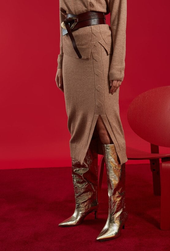 Dopasowana spódnica wykonany z miękkiej dzianiny na bazie wiskozy z ozdobnym warkoczem. Ma modny odcień beżowego melanżu, który dobrze komponuje się zarówno z paletą barw nude, jak i klasycznymi kolorami. Spódnica występują do kompletu ze swetrem tworząc bardzo kobiecy i modny duet. To idealna propozycja do pracy i na wyjścia ze znajomymi dodatkowo dopasowany krój podkreśla sylwetkę. Modelka na zdjęciu ma 171 cm wzrostu i prezentuje rozmiar S.