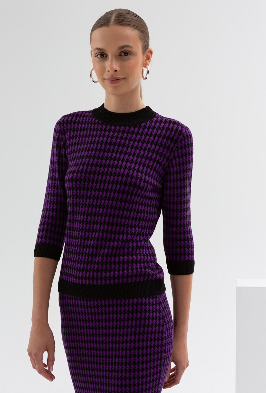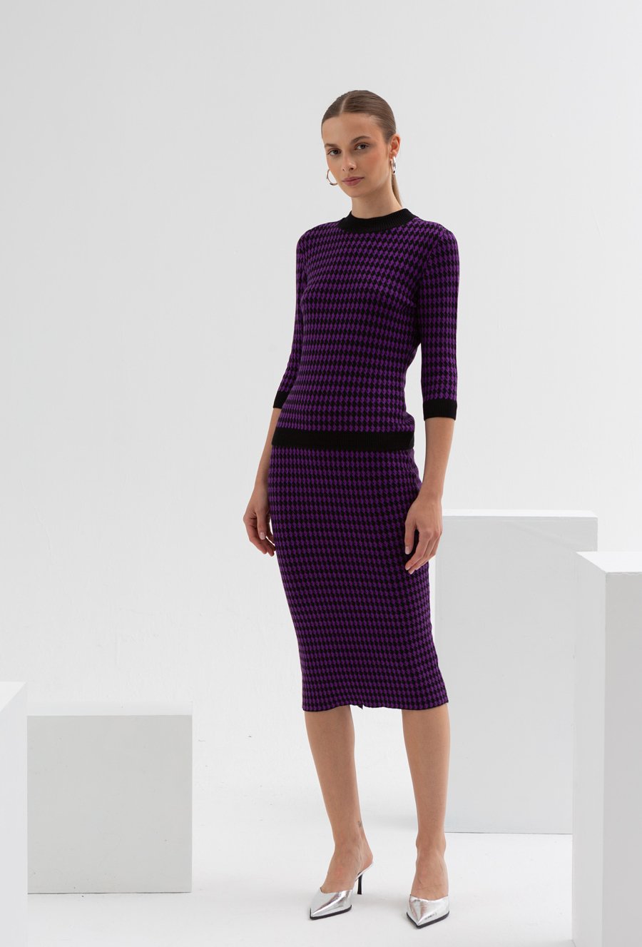 Kobieca spódnica o dopasowanym, ołówkowym fasonie. Wykona z przyjemnej w dotyku wiskozy. W pasie posiada komfortową gumkę. Występuje w komplecie ze swetrem. Ten bardzo kobiecy model, pięknie podkreśli kształty kobiecej sylwetki. To świetna propozycja na jesienne wyjścia i sprawi , ze będziesz wyglądała pięknie. Modelka na zdjęciu ma 177 cm wzrostu i prezentuje rozmiar 36.