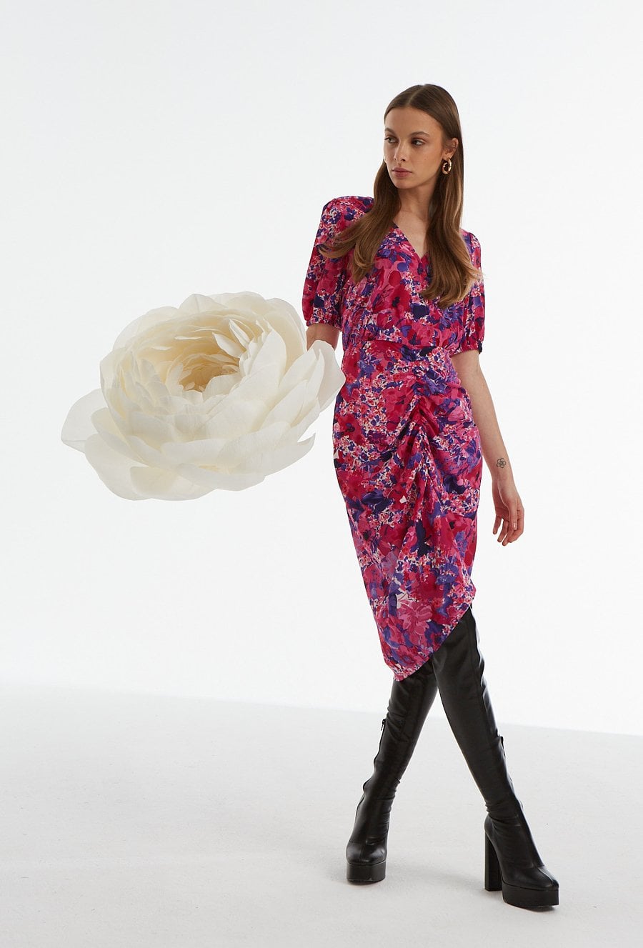 Sukienka damska w kobiecy, różowo-fioletowy motyw kwiatowy, wykonana z satynowej tkaniny. Posiada kopertowy dekolt zabezpieczony guzikiem, oraz krótki rękaw. Charakteru i kobiecości dodaje jej marszczenie z przodu. Będzie idealną propozycją na wyjątkową okazję jako element przyciągający wzrok! W tej sukience nie przejdziesz niezauważona! Modelka na zdjęciu ma 174 cm wzrostu i prezentuje rozmiar 36.