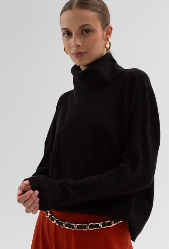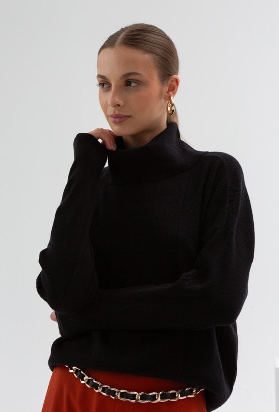 Czarny golf wykonany z przyjemnej w dotyku wiskozowej dzianiny. Posiada długie rękawy z obniżoną linią ramion, przy nadgarstkach zakończone ściągaczem. Luźny fason, niekrępujący ruchów. Długość do pasa, zakończony szerokim ściągaczem. Ten model świetnie sprawdzi się w jesiennych i zimowych stylizacjach. Modelka na zdjęciu ma 178 cm wzrostu i prezentuje rozmiar 36.