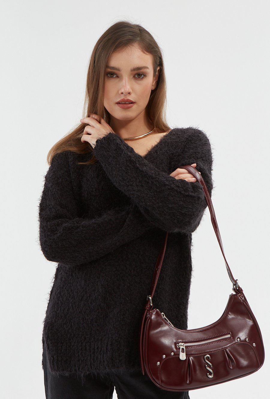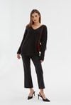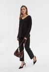 Czarny sweter z miękkiej przędzy bouclé. Ten model będzie nas ogrzewał całą jesień. Ma luźny fason , długie rękawy z obniżoną linią ramion oraz głęboki dekolt w v-nek. Bardzo mięciutka i przyjemna dzianina, sprawi, że będziemy czuć się bardzo komfortowo. Ten model będzie doskonałym uzupełnieniem jesiennej garderoby a do tego jest bardzo wygodny. Modelka na zdjęciu ma 171 cm wzrostu i prezentuje rozmiar S.