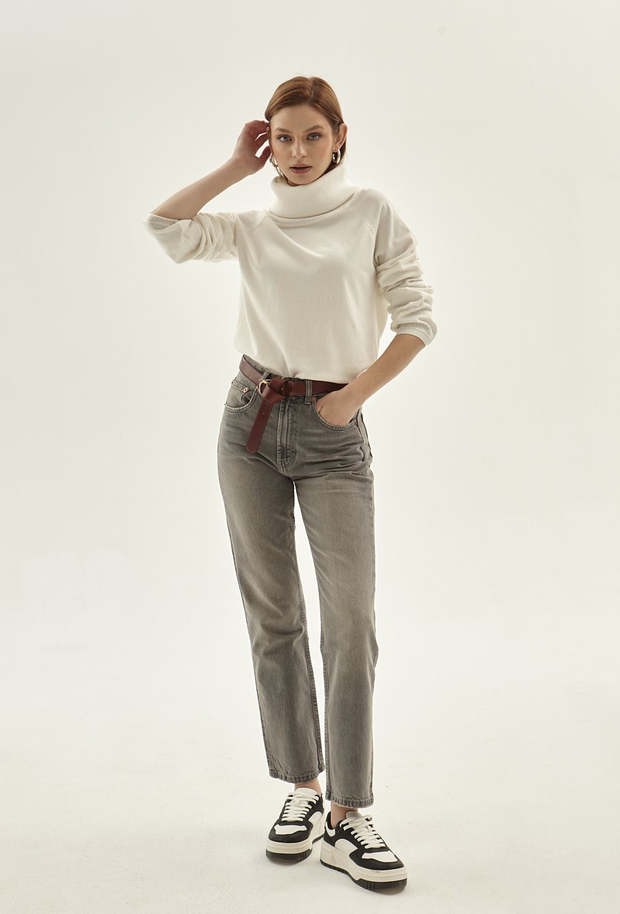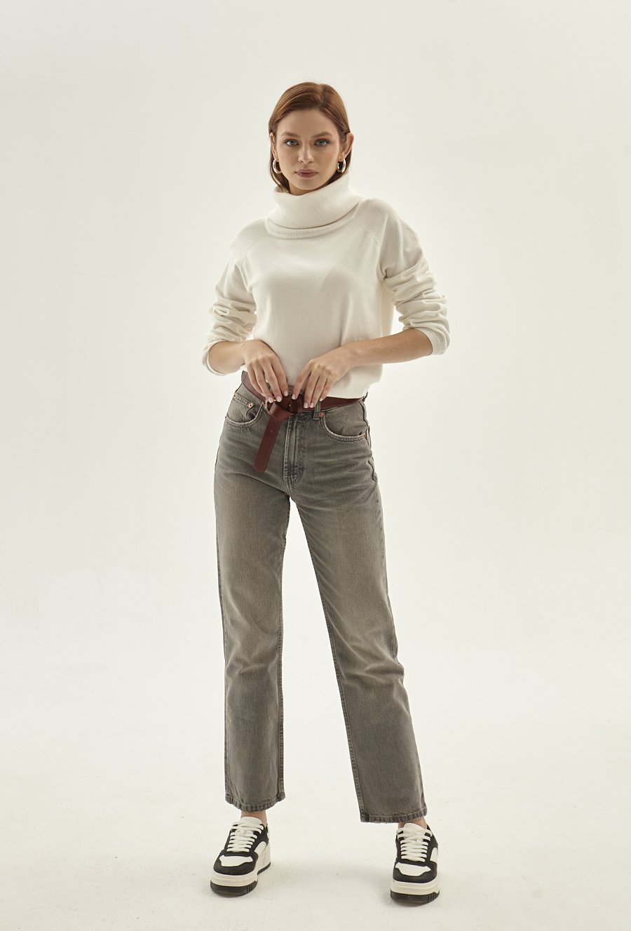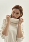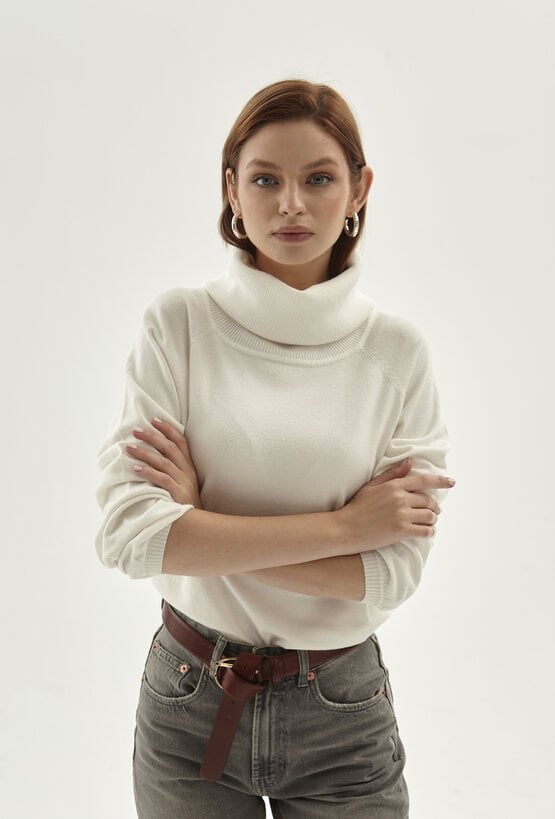 Sweter w białym kolorze wykonany z miękkiej dzianiny z wiskozą. Ma obszerny golf, który będzie nas ogrzewał w chłodne dni. Sweter ma swobodny fason, długie rękawy zakończone ściągaczem. Ten model z pewnością będzie pasować do licznych stylizacji. Modelka na zdjęciu ma 175 cm wzrostu i prezentuje rozmiar 36.