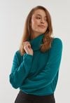 Sweter w zielony kolorze wykonany z miękkiej dzianiny z wiskozą. Ma obszerny golf, który będzie nas ogrzewał w chłodne dni. Sweter ma swobodny fason, długie rękawy zakończone ściągaczem. Ten model z pewnością będzie pasować do licznych stylizacji. Modelka na zdjęciu ma 175 cm wzrostu i prezentuje rozmiar 36.