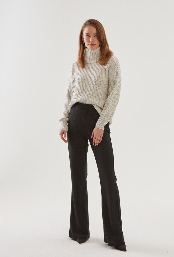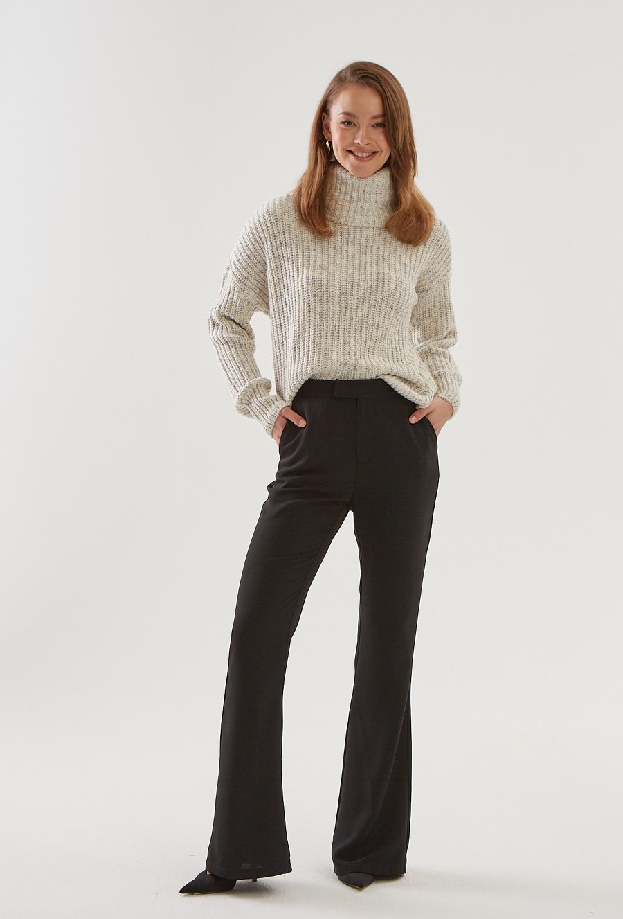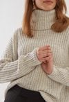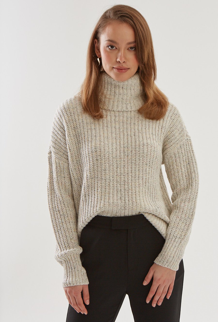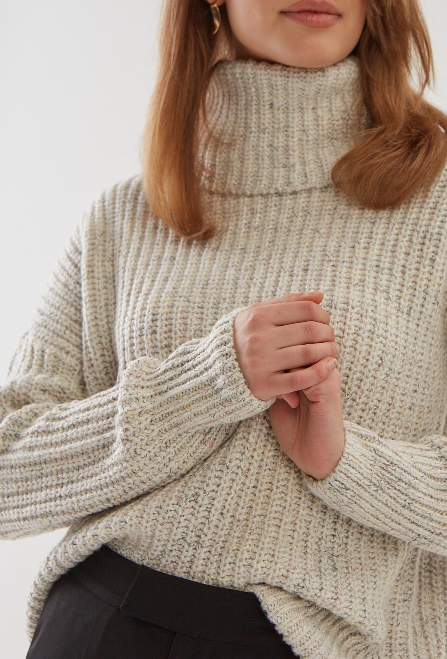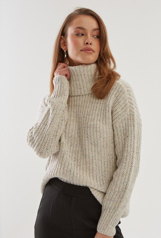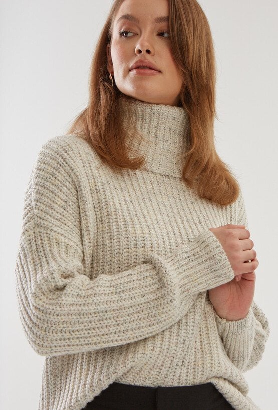 Beżowy golf o luźnym fasonie z kolorową włóczka. Długie rękawy, opuszczona linia ramion. Ten uniwersalny model, idealnie nadaje się zarówno na jesienno-zimowe chłody, jak również jako okrycie wierzchnie np. na letnie wieczory. Modelka na zdjęciu ma 178 cm wzrostu i prezentuje rozmiar 36.