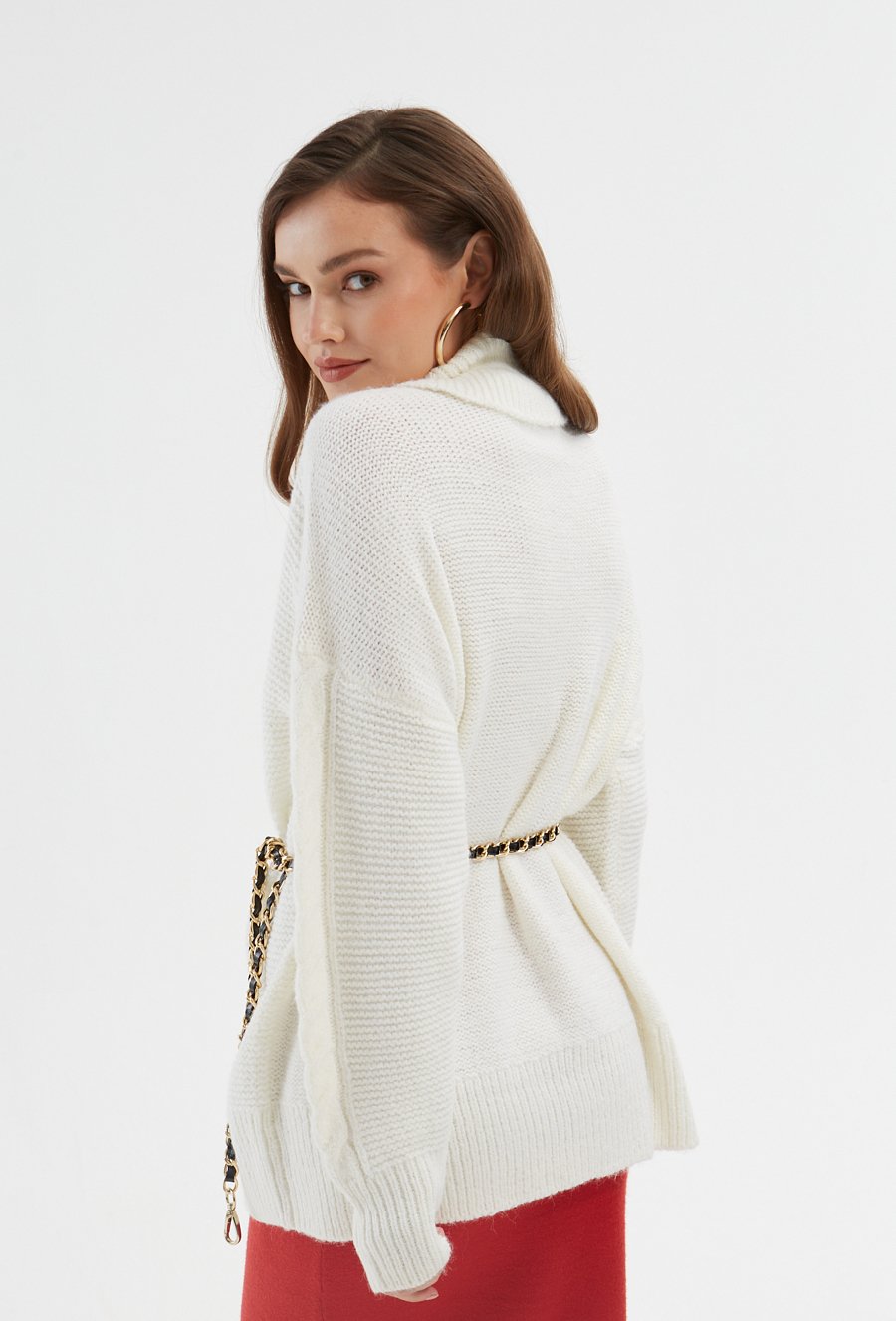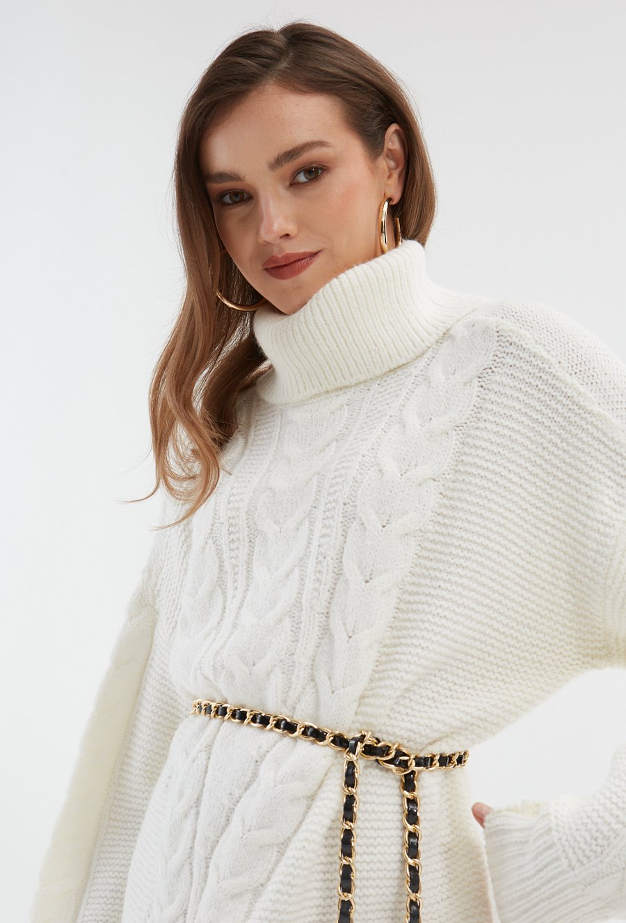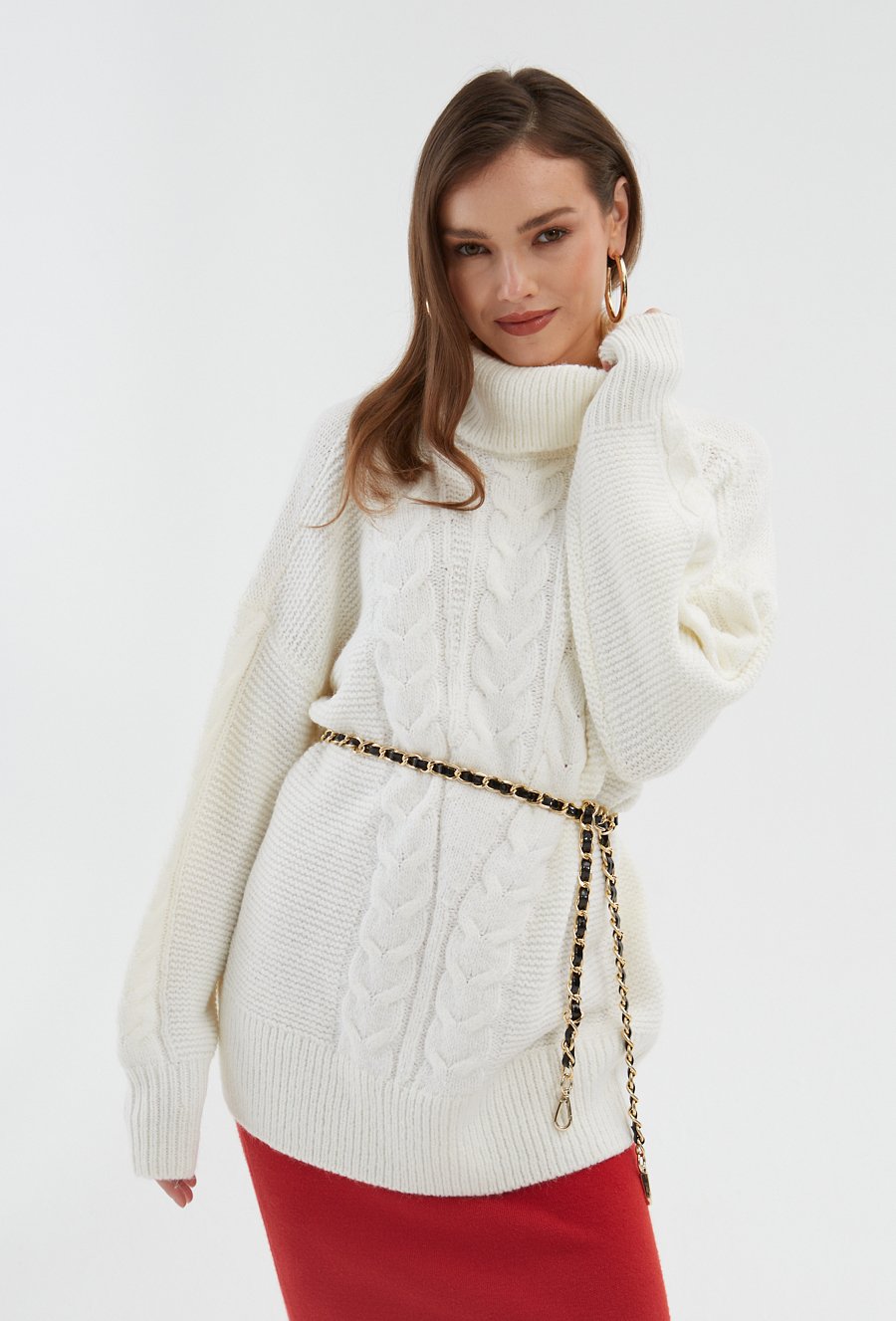 Kremowy ciepły sweter z golfem to jedna z naszych ulubionych zimowych propozycji. Ciepły sweter będzie nas ogrzewał w chłodne zimowe dni. Duży golf, w który będziemy mogły się schować, kiedy tylko zrobi się chłodno. Ozdobny spot poczwarkowy, który nadaje charakteru. Ten model dobrze wygląda z paskiem. Modelka na zdjęciu ma 171 cm wzrostu i prezentuje rozmiar S.