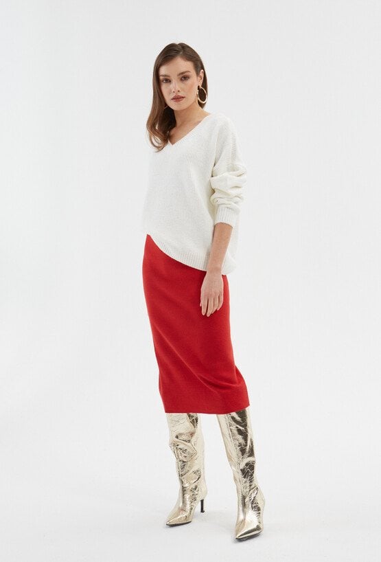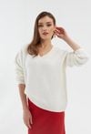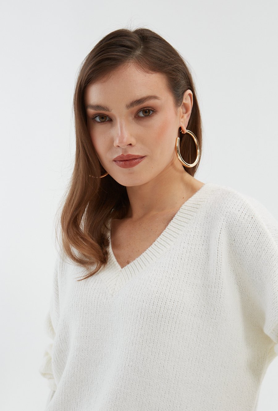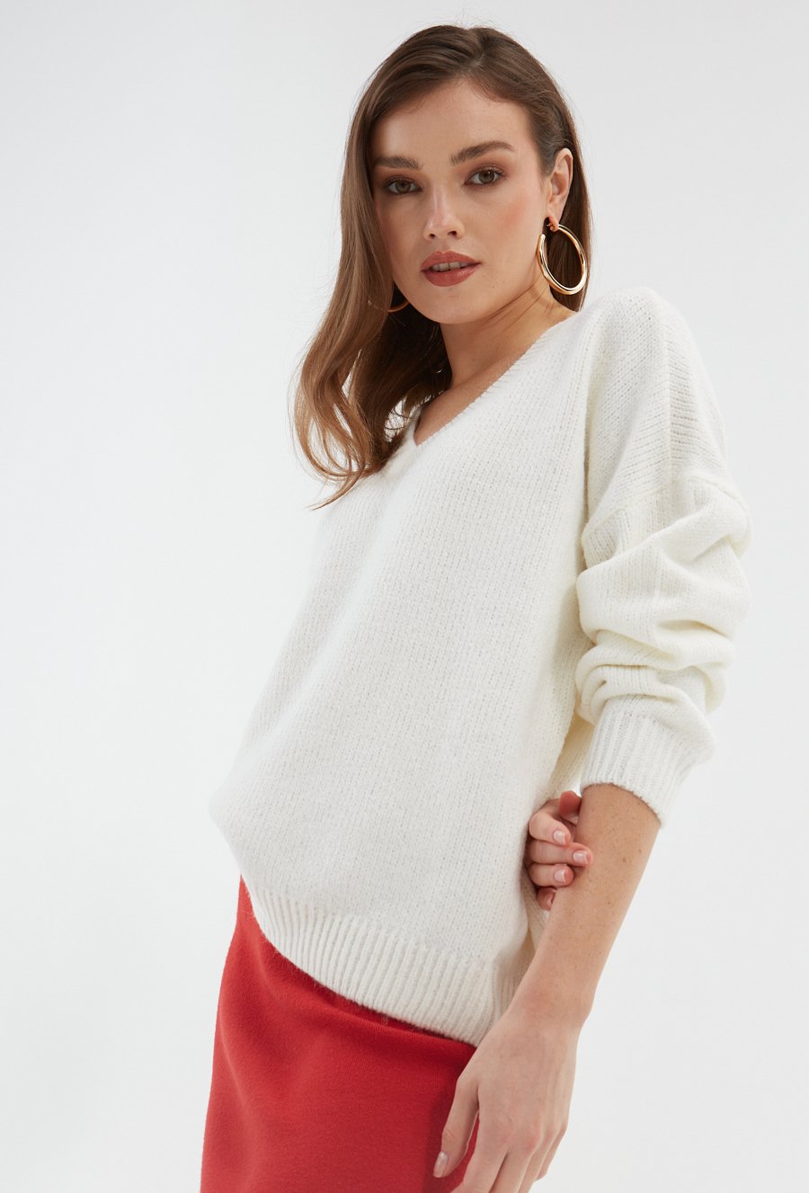Sweter grubym splocie, doskonale sprawdzi się na jesienne wieczory, otuli nas w chłodne dni. Ma luźny fason z obniżoną linia ramion oraz dekolt w literę V. Sweter wykonany jest z milej w dotyku dzianiny. Modelka na zdjęciu ma 171 cm wzrostu i prezentuje rozmiar 36.