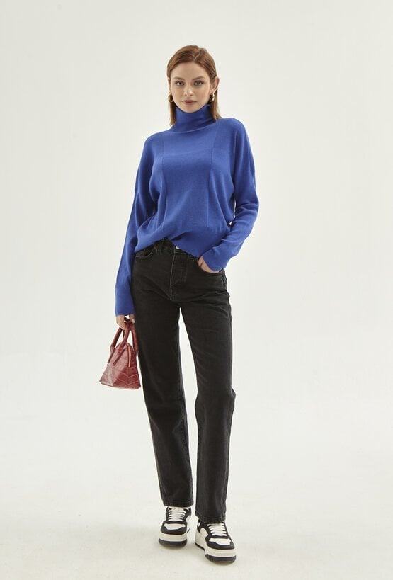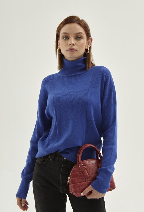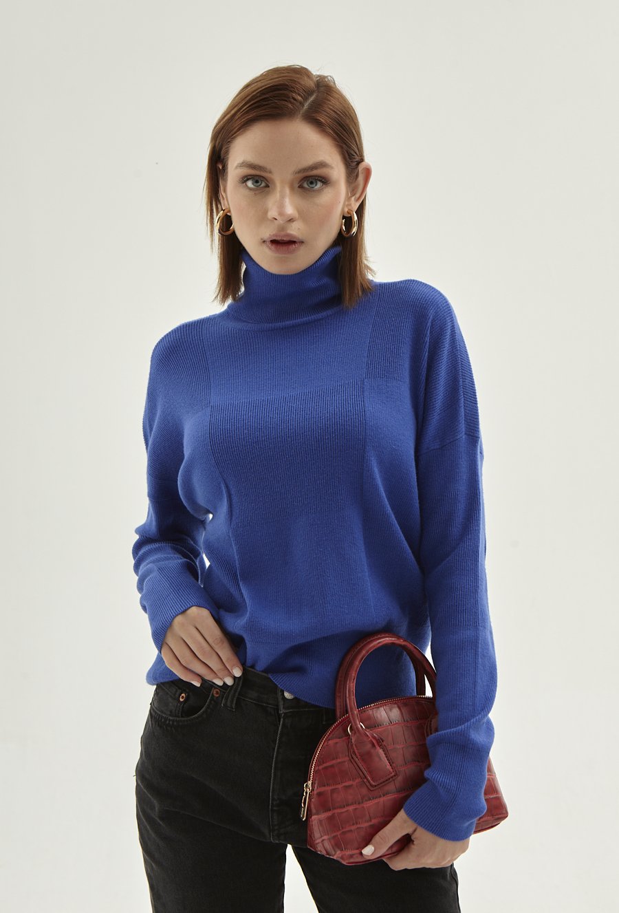 Niebieski golf wykonany z przyjemnej w dotyku wiskozowej dzianiny. Posiada długie rękawy z obniżoną linią ramion, przy nadgarstkach zakończone ściągaczem. Luźny fason, niekrępujący ruchów. Długość do pasa, zakończony szerokim ściągaczem. Ten model świetnie sprawdzi się w jesiennych i zimowych stylizacjach. Modelka na zdjęciu ma 178 cm wzrostu i prezentuje rozmiar 36.