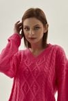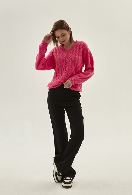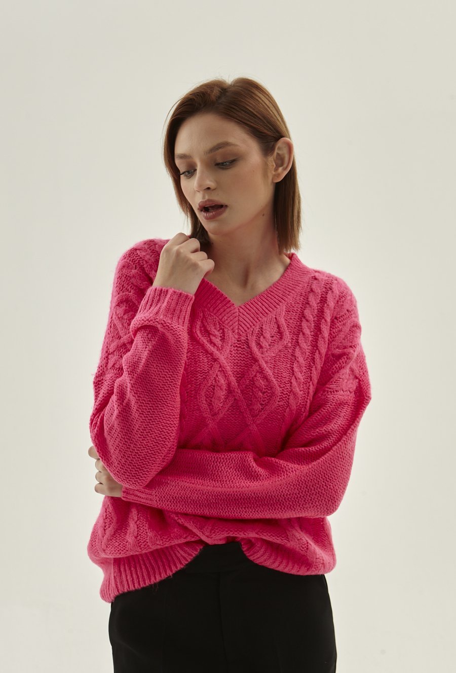 Sweter w kolorze soczystego różu z warkoczowym splotem, to idealna propozycja do codziennych, jesiennych stylizacji. Sweter z długimi rękawami oraz dekoltem w V-nek, brzegi wykończone ściągaczem. Modelka na zdjęciu ma 175 cm wzrostu i prezentuje rozmiar S.