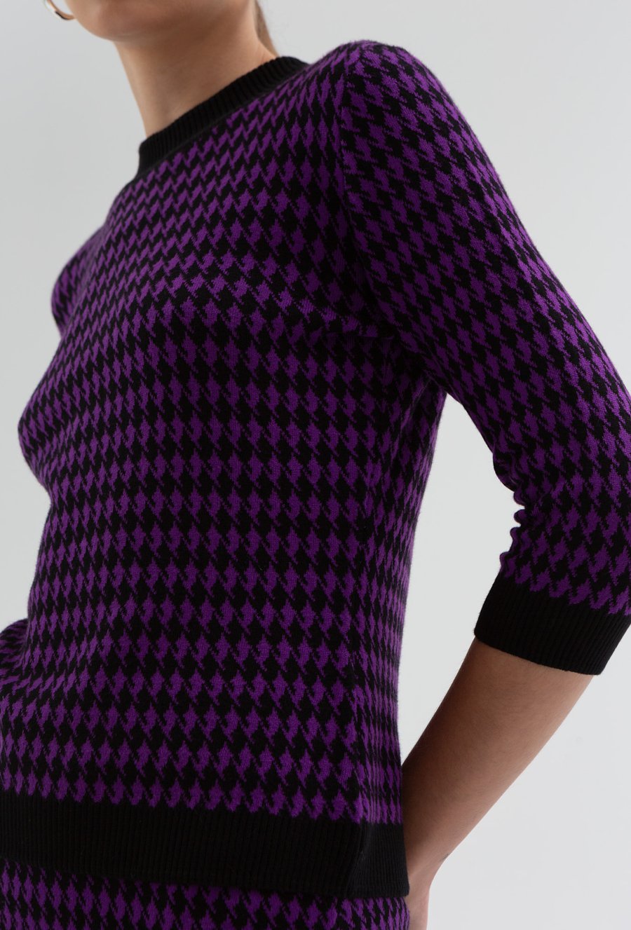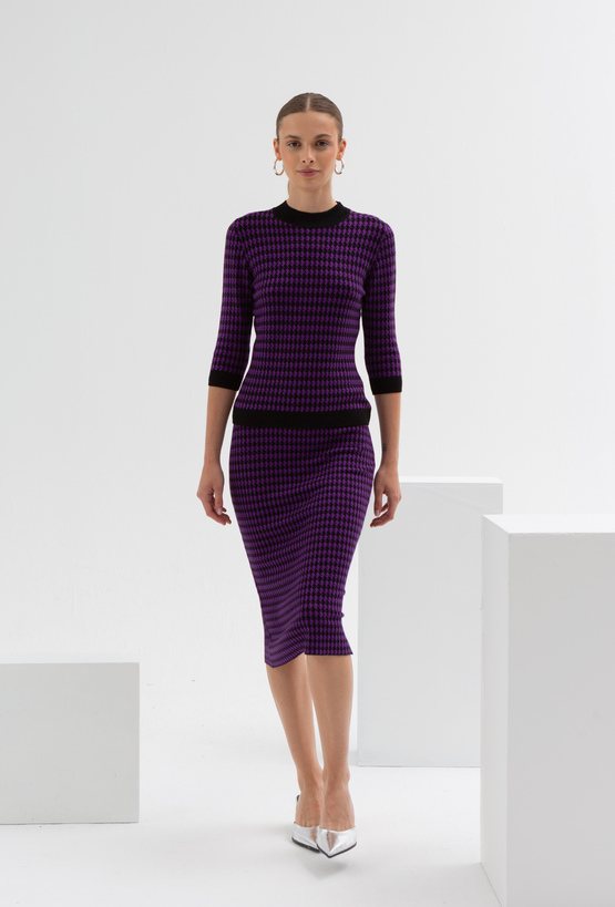 Sweter o dopasowanym fasonie w pepitkę wykony z przyjemnej w dotyku wiskozy. Rękawy 3/4 oraz okrągły dekolt. Występuję w komplecie ze spódnicą. To świetna propozycja na jesienne wyjścia nie tylko będzie Cię ogrzewać w jesienne chłody ale sprawi , ze będziesz wyglądała pięknie. Modelka na zdjęciu ma 177 cm wzrostu i prezentuje