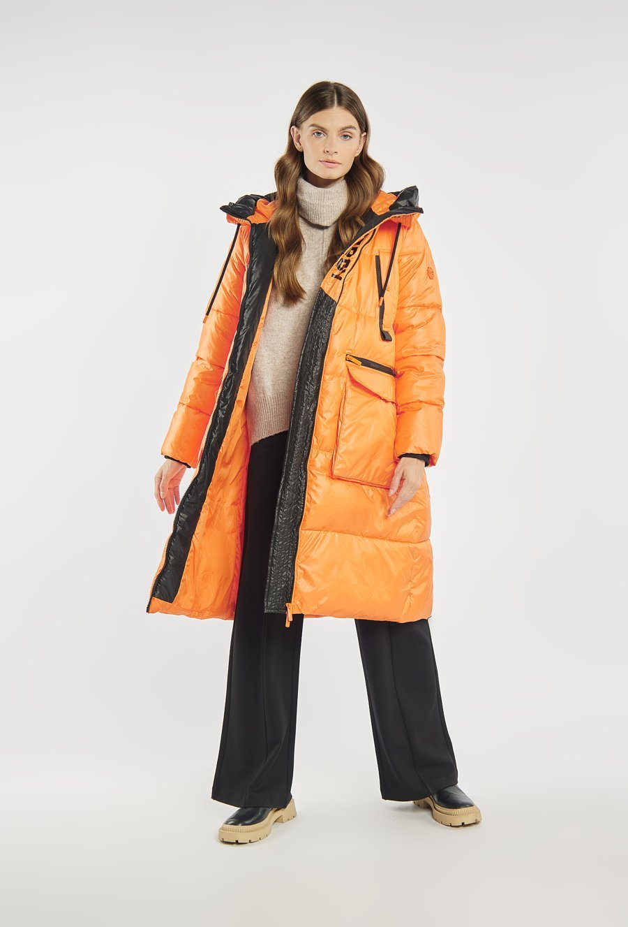 Pikowany płaszcz damski o przedłużonym kroju, doskonały na zimowe dni. Model z kapturem. Z przodu duże, naszywane kieszenie oraz dodatkowe kieszenie zapinane na suwak, które podkreślają funkcjonalność i wygodę. Modelka na zdjęciu ma 177 cm wzrostu i prezentuje rozmiar 36.