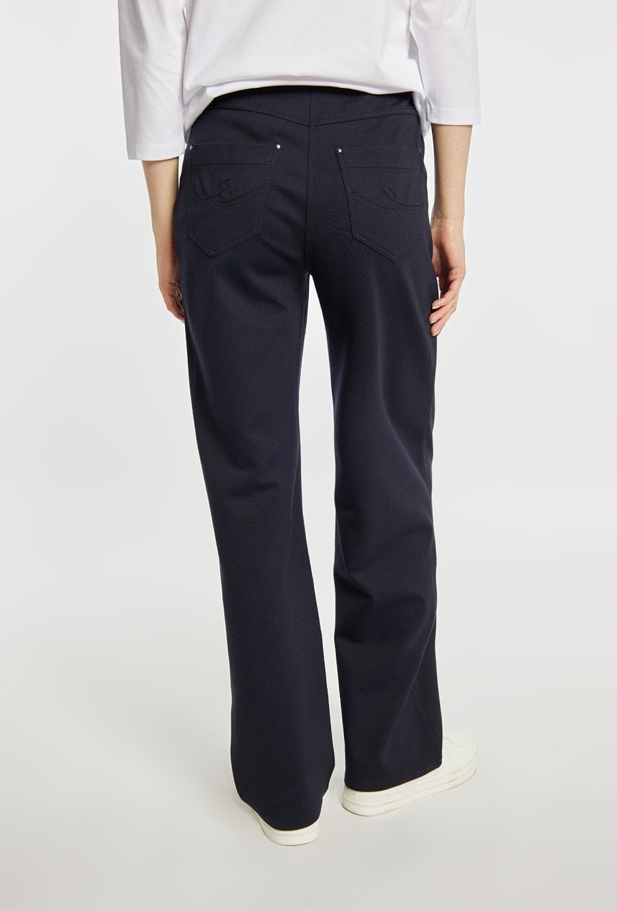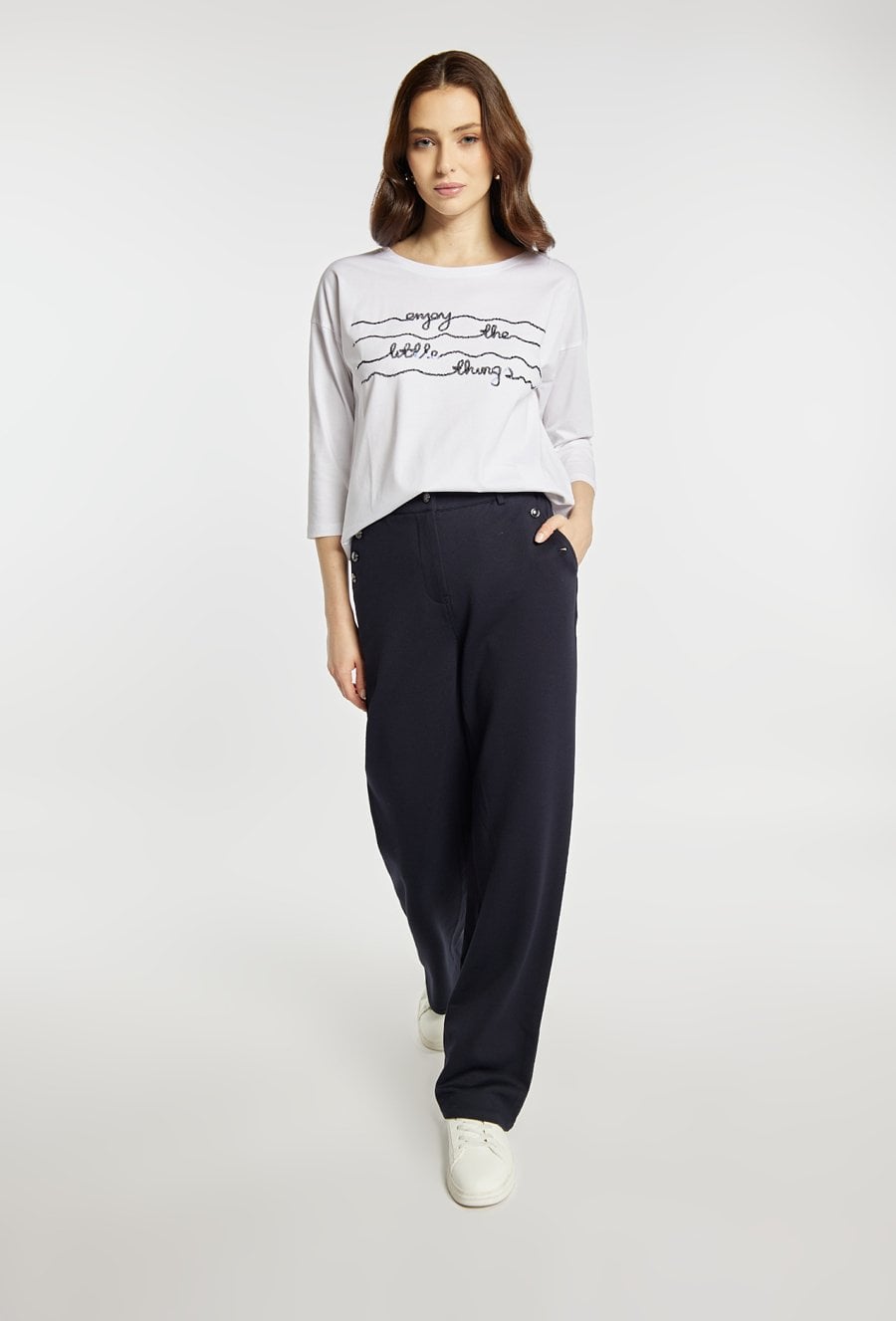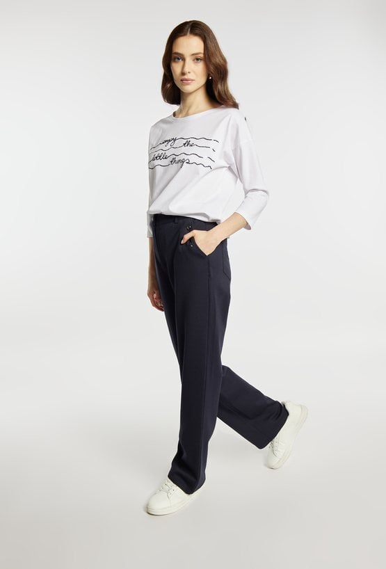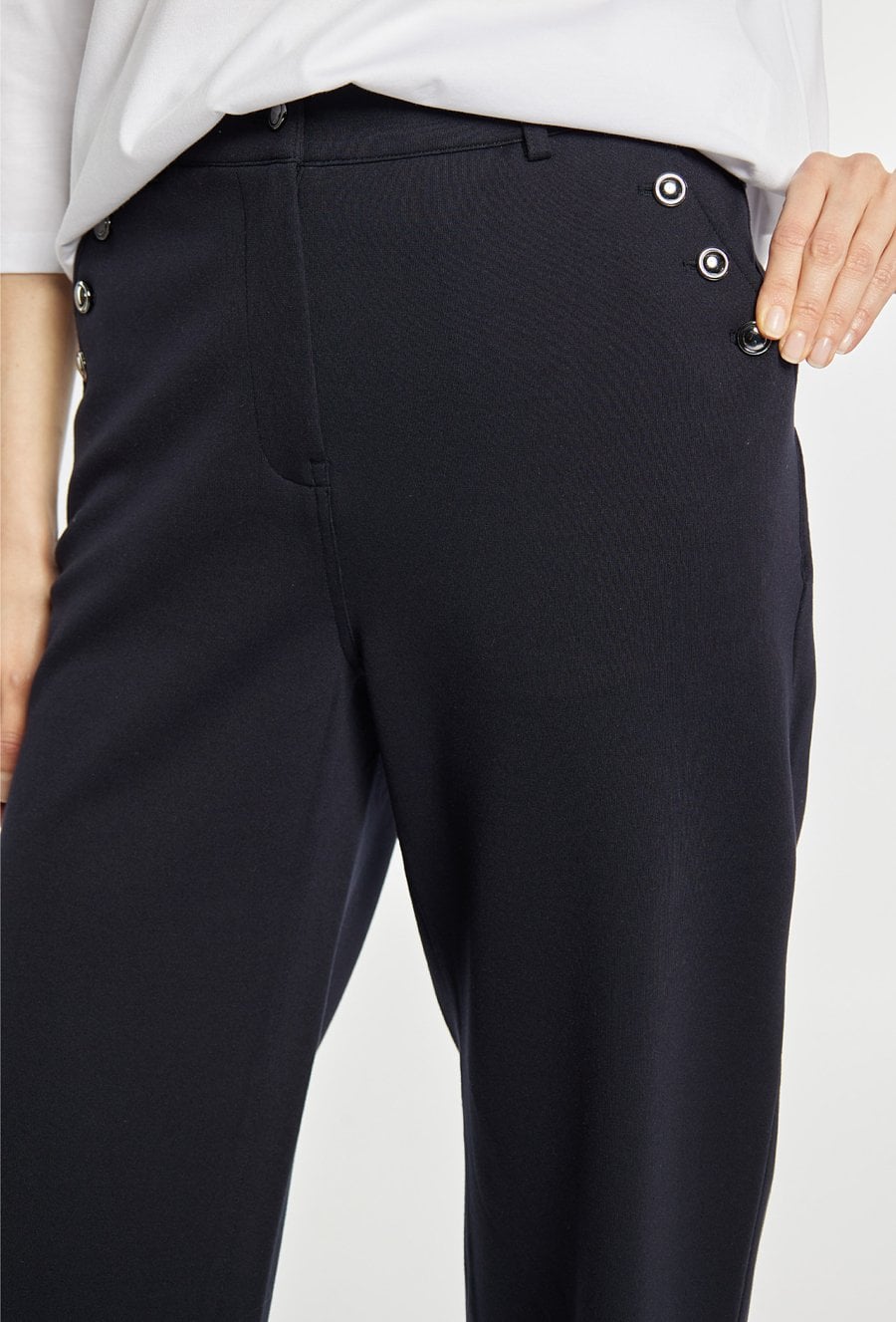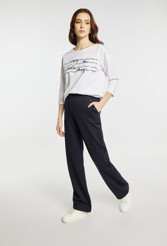 Spodnie damskie o eleganckim, prostym kroju. Spodnie z prostą nogawką i klasycznym stanem wyróżniają się ozdobnymi guzikami przy kieszeniach, które nadają im subtelnie eleganckiego charakteru. Model doskonale sprawdzi się zarówno w stylizacjach do pracy, jak i na bardziej formalne wyjścia. Spodnie można z powodzeniem zestawić z marynarką, tworząc spójny, stylowy komplet. Kod do marynarki: 26W-BZR0080. Modelka na zdjęciu ma 177 cm wzrostu i prezentuje rozmiar 36.
