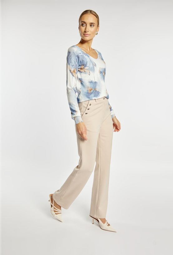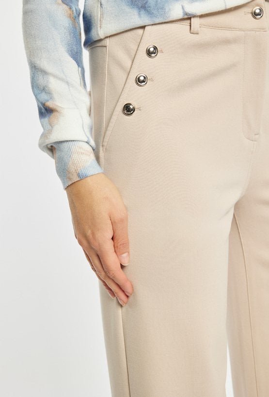 Spodnie damskie o eleganckim, prostym kroju. Spodnie z prostą nogawką i klasycznym stanem wyróżniają się ozdobnymi guzikami przy kieszeniach, które nadają im subtelnie eleganckiego charakteru. Model doskonale sprawdzi się zarówno w stylizacjach do pracy, jak i na bardziej formalne wyjścia. Modelka na zdjęciu ma 177 cm wzrostu i prezentuje rozmiar 36.