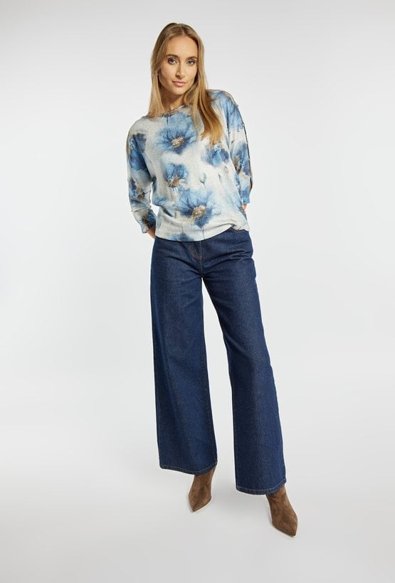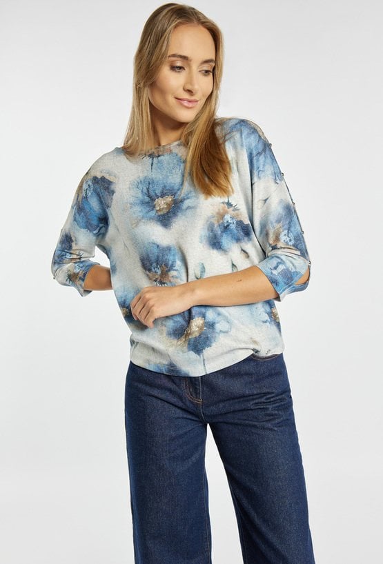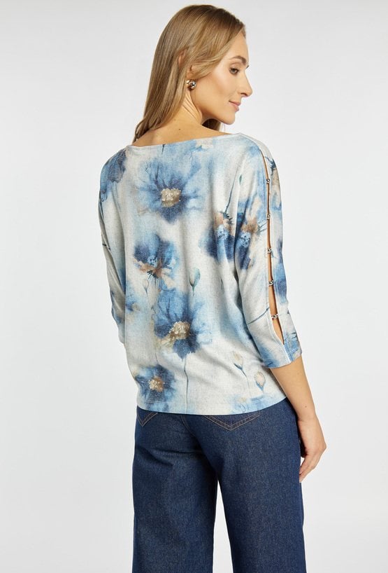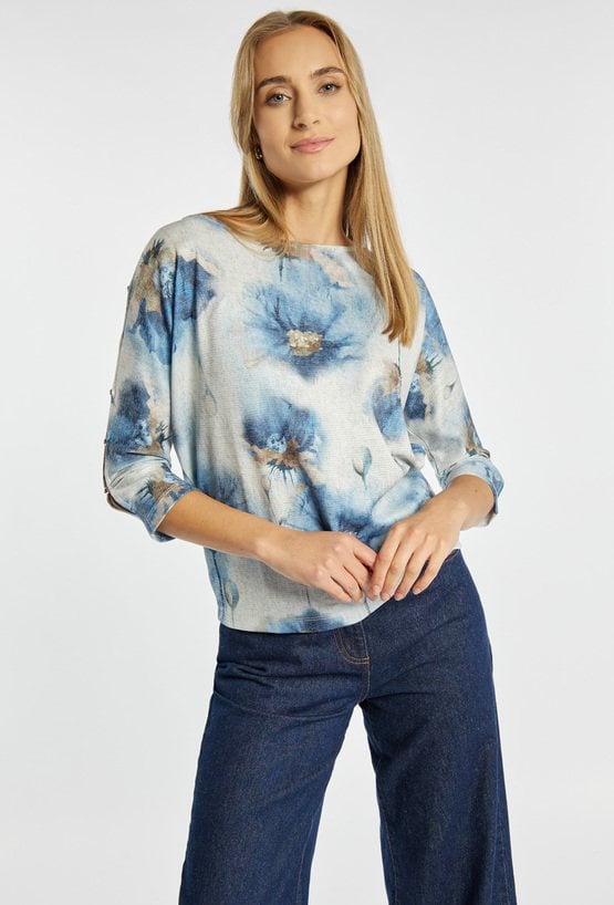 Bluzka damska z malarskim, kwiatowym nadrukiem. Model z małymi rozcięciami na rękawach wykończonymi subtelnymi guziczkami, co dodaje lekkości i zwiewnego charakteru. Swobodny fason dobrze układa się na sylwetce i sprawdzi się zarówno do jeansów, jak i bardziej eleganckich dołów. Modelka na zdjęciu ma 177 cm wzrostu i prezentuje rozmiar S.