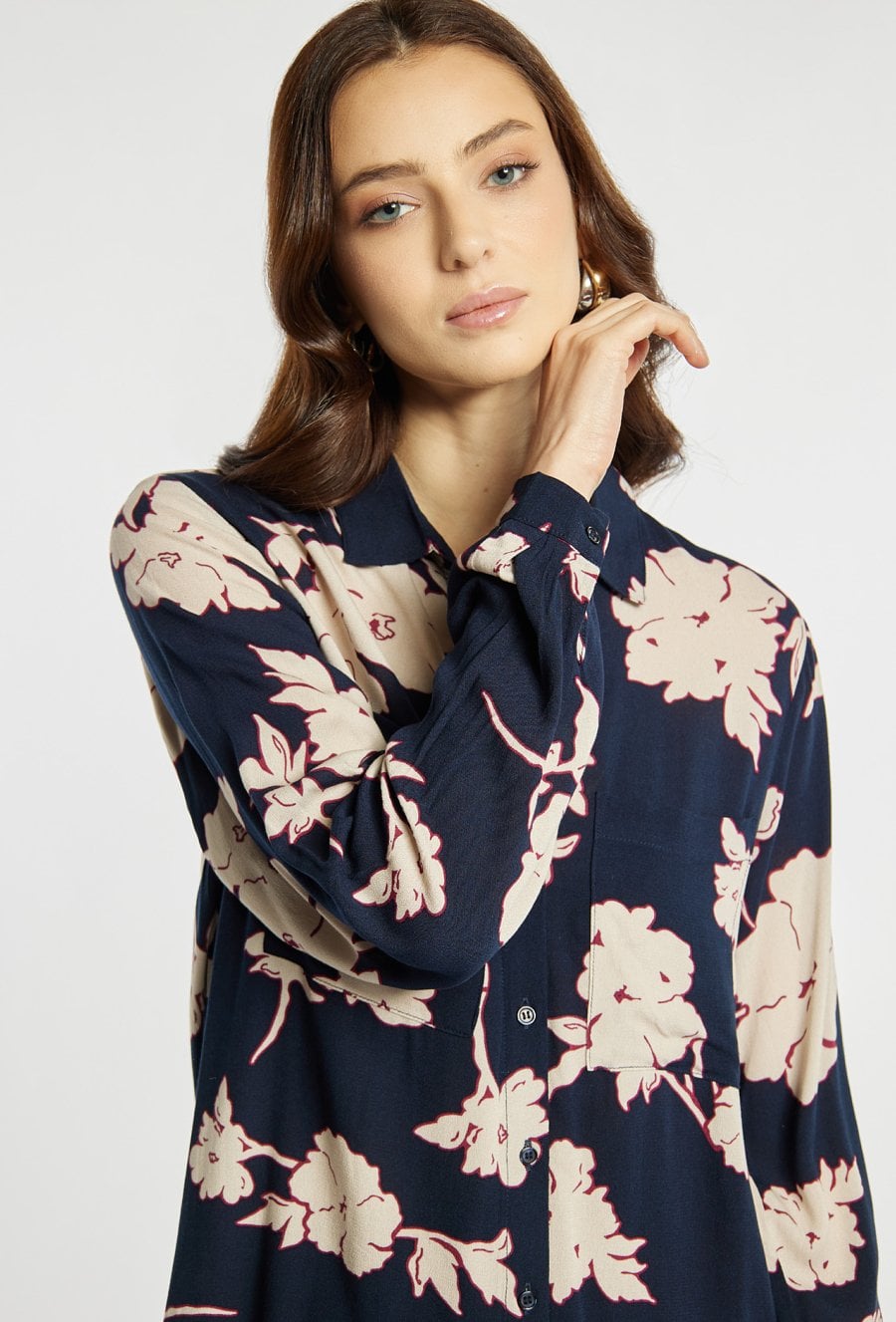 Koszula damska wykonana z lekkiego, przyjemnego w dotyku materiału. Koszula o wydłużonym kroju z klasycznym kołnierzykiem i długim rękawem wyróżnia się modnym wzorem. Model idealny do codziennych i eleganckich zestawów- świetnie prezentuje się zarówno luźno, jak i wpuszczona w spodnie. Modelka na zdjęciu ma 177 cm wzrostu i prezentuje rozmiar 36.