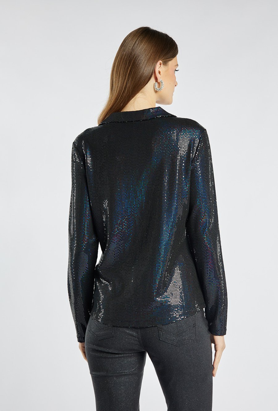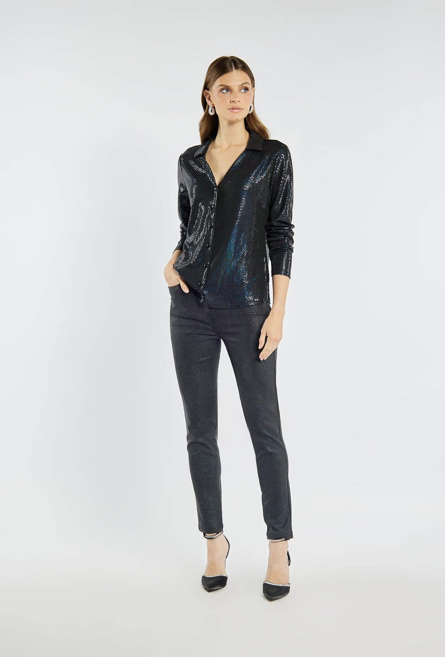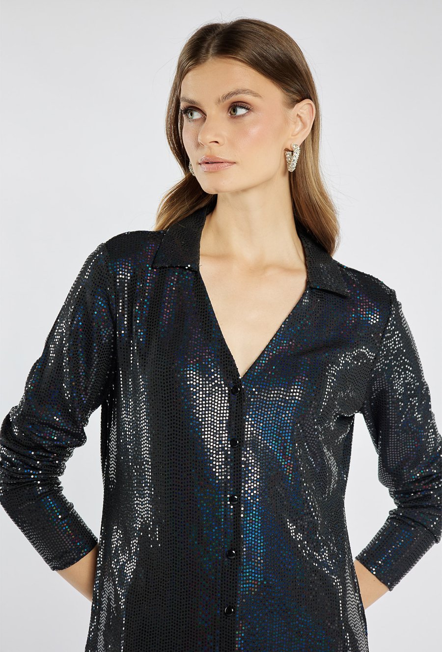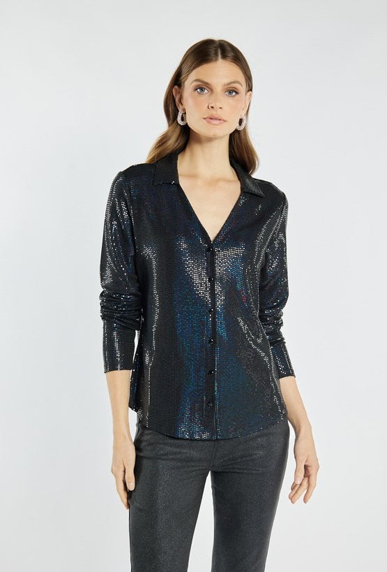 Koszula damska o niezwykle efektownym, błyszczącym wykończeniu. Koszula z kołnierzem, długimi rękawami i zapięciem na guziki. To idealna propozycja na wieczorne wyjścia, święta czy sylwestra. Modelka na zdjęciu ma 177 cm wzrostu i prezentuje rozmiar S.