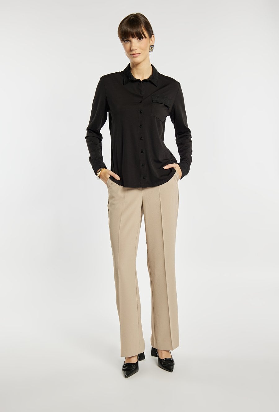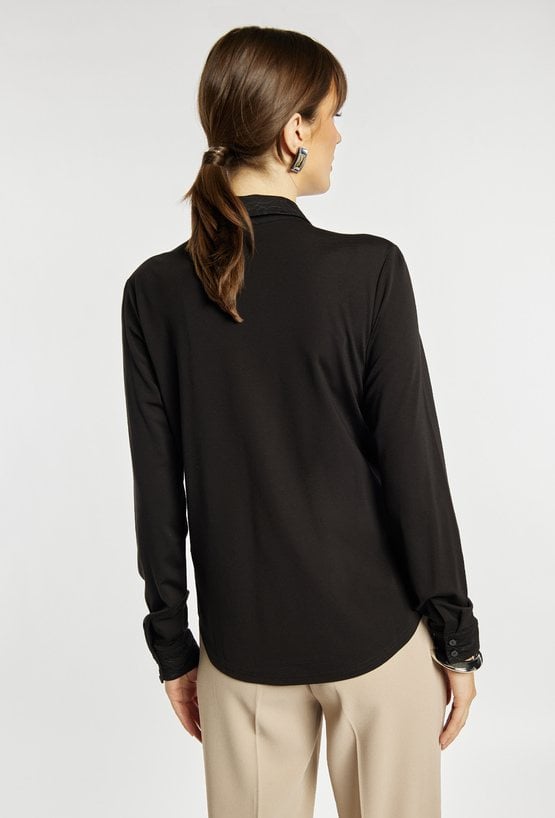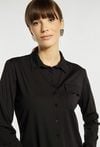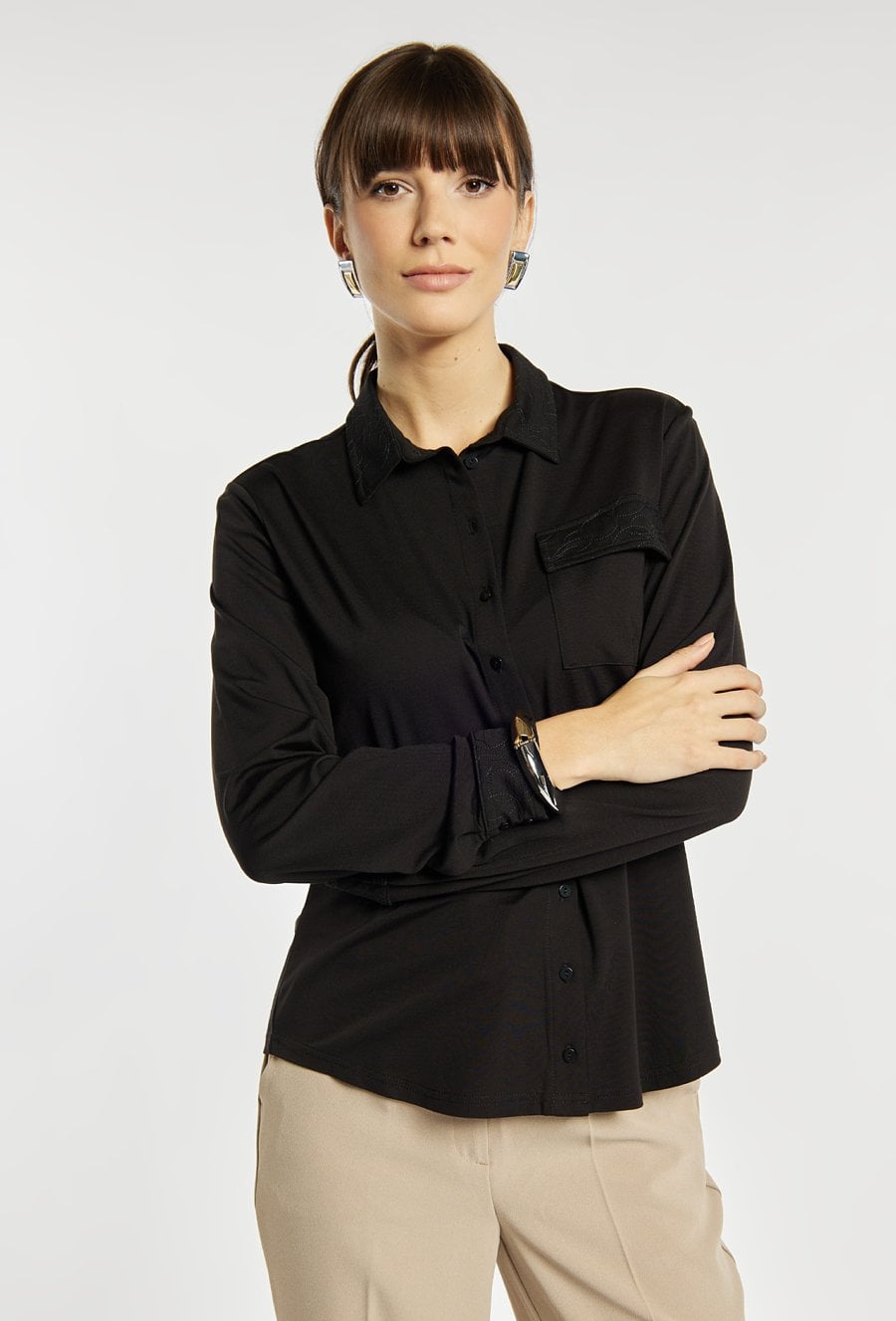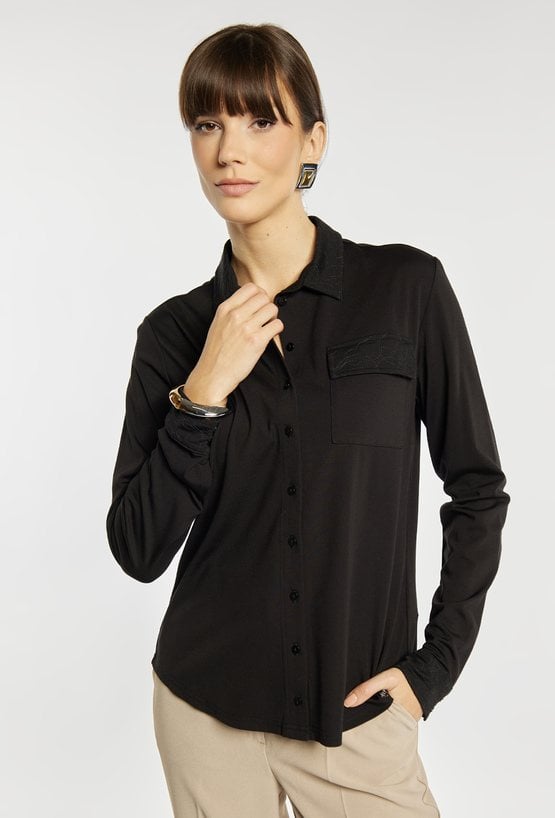 Koszula damska o prostym, eleganckim kroju. Koszula ma długie rękawy, kołnierzyk oraz zapięcie na guziki na całej długości. Koszula została urozmaicona kieszonką na piersi z subtelnym, dekoracyjnym wykończeniem. Idealna zarówno do biurowych, jak i codziennych stylizacji. Modelka na zdjęciu ma 177 cm wzrostu i prezentuje rozmiar S.