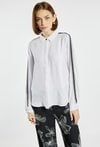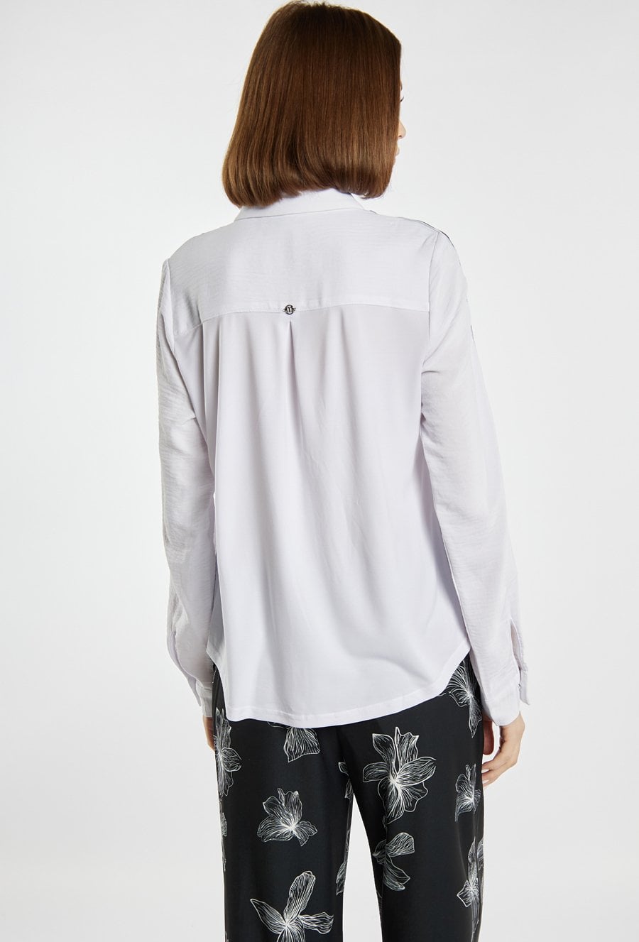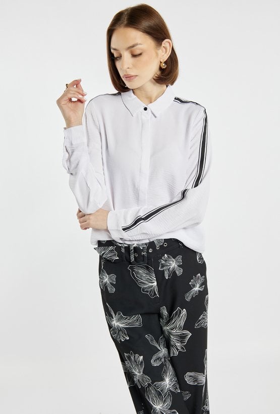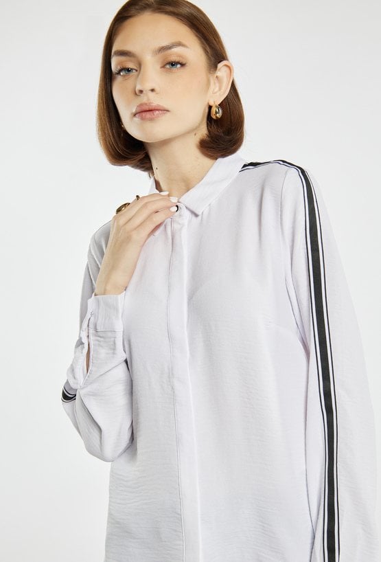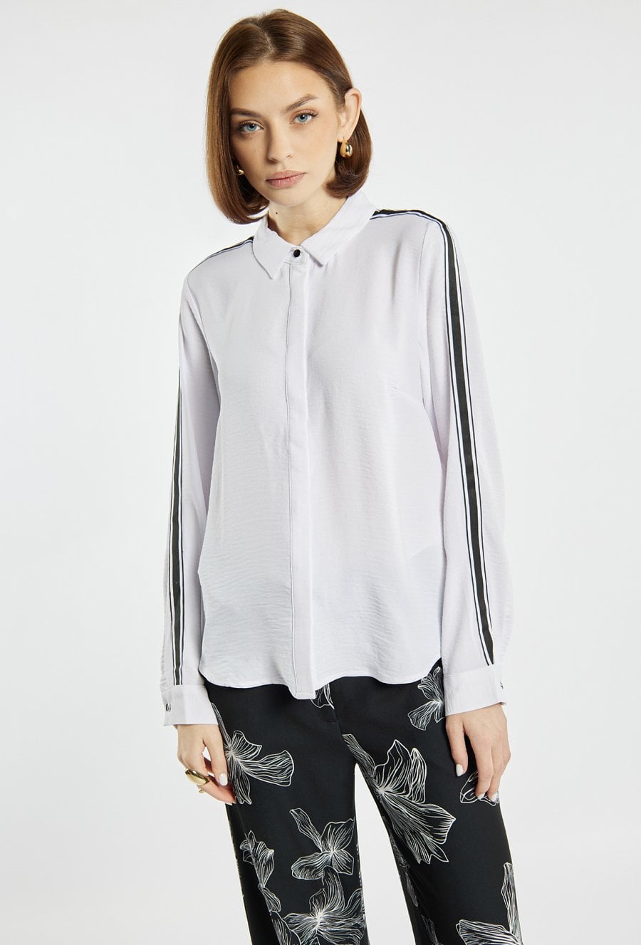Koszula damska o prostym, klasycznym kroju. Model z kołnierzykiem, w całości zapinany na guziki, z długim rękawem zakończonym mankietem. Kontrastowe lampasy wzdłuż rękawów dodają całości nowoczesnego i lekko sportowego charakteru. Modelka na zdjęciu ma 177 cm wzrostu i prezentuje rozmiar S.