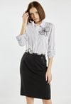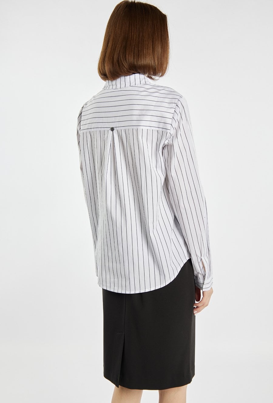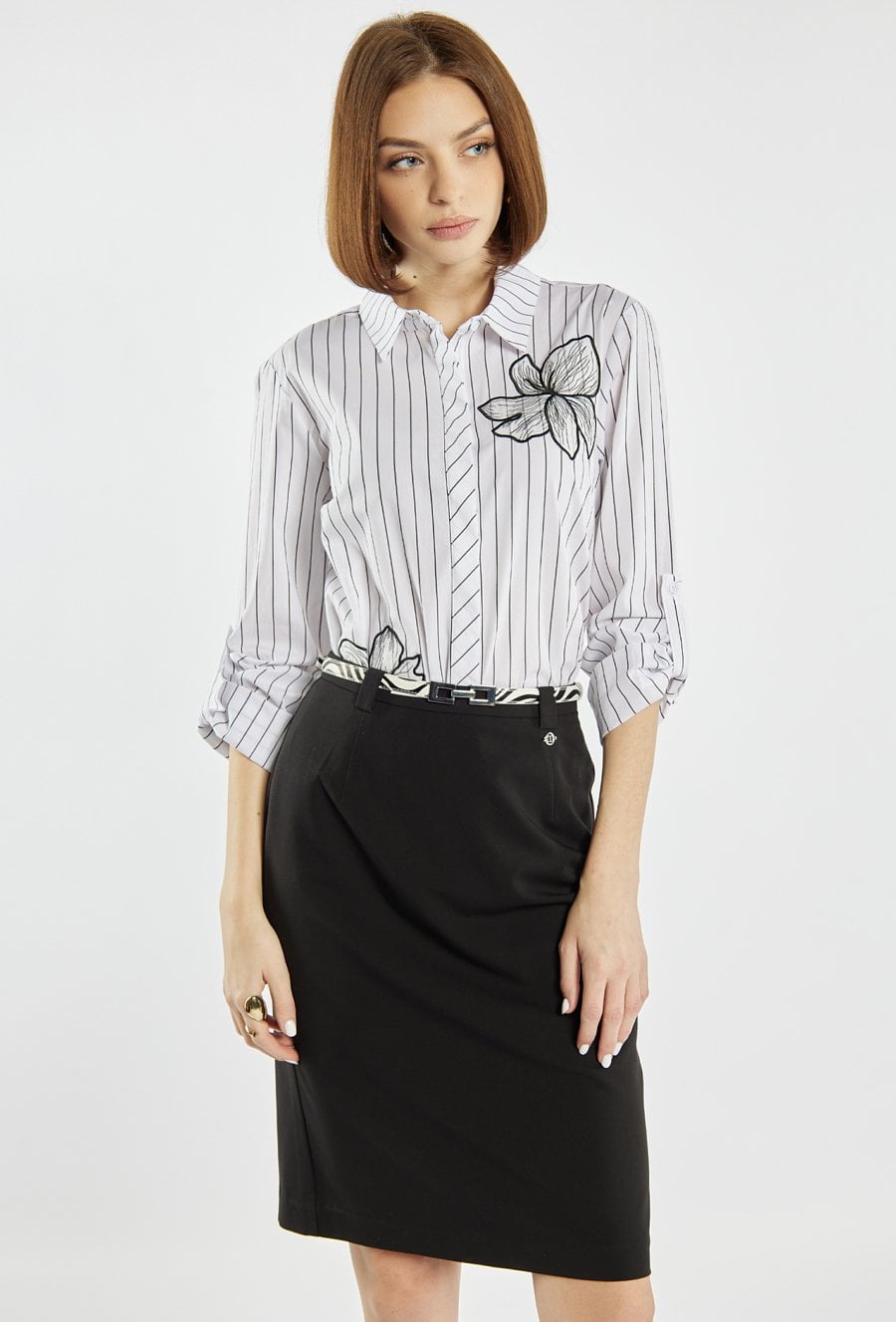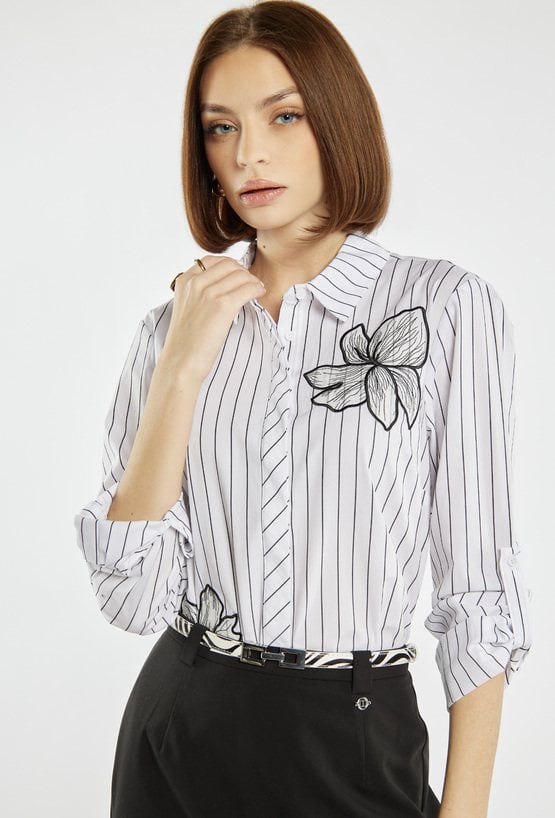 Koszula damska o klasycznym kroju, wykonana z lekkiego materiału w pionowe paski. Model z kołnierzykiem, w całości zapinany na guziki, z długim rękawem z możliwością podpięcia. Ozdobna, kontrastowa aplikacja kwiatowa nadaje całości kobiecego i oryginalnego charakteru. Koszula dobrze układa się na sylwetce i zapewnia komfort noszenia. Modelka na zdjęciu ma 177 cm wzrostu i prezentuje rozmiar 36.