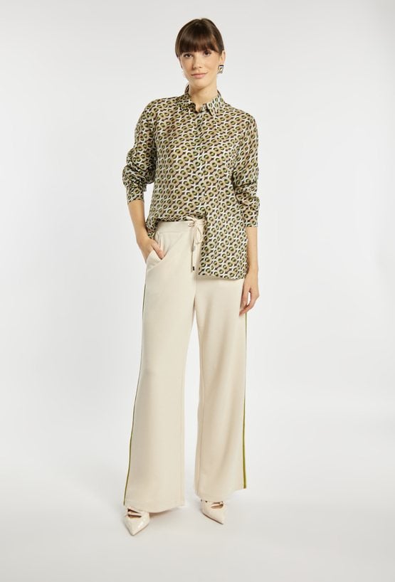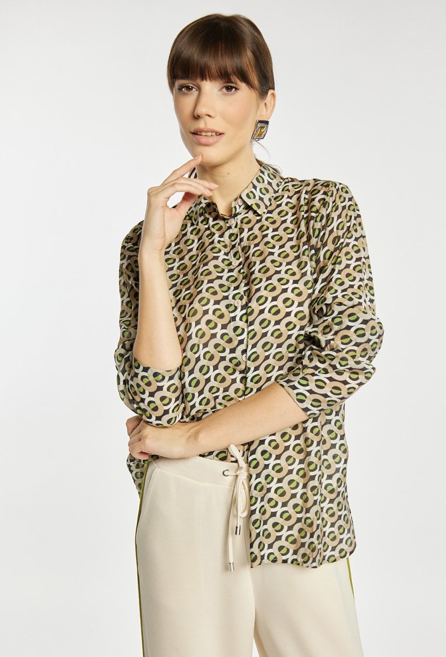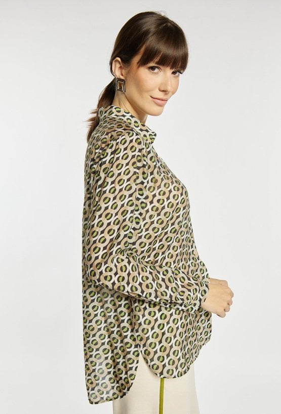 Koszula damska wykonana z dodatkiem wiskozy. Klasyczny krój z kołnierzykiem i zapięciem na guziki sprawia, że model ten doskonale sprawdzi się zarówno w eleganckich, jak i codziennych stylizacjach. Modelka na zdjęciu ma 177 cm wzrostu i prezentuje rozmiar 36.