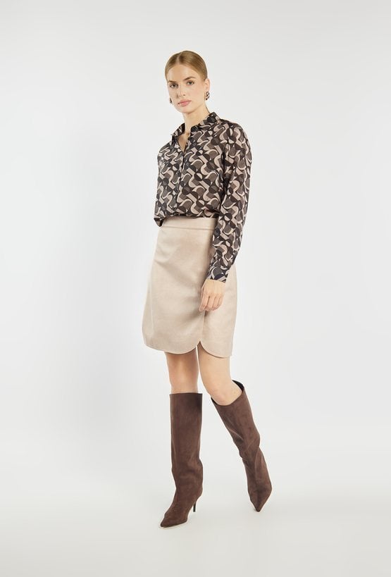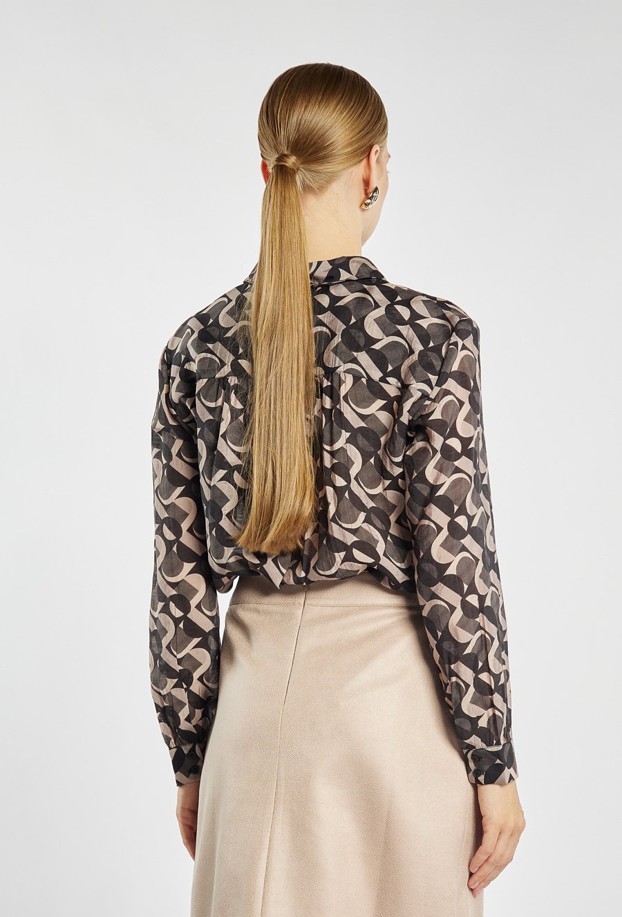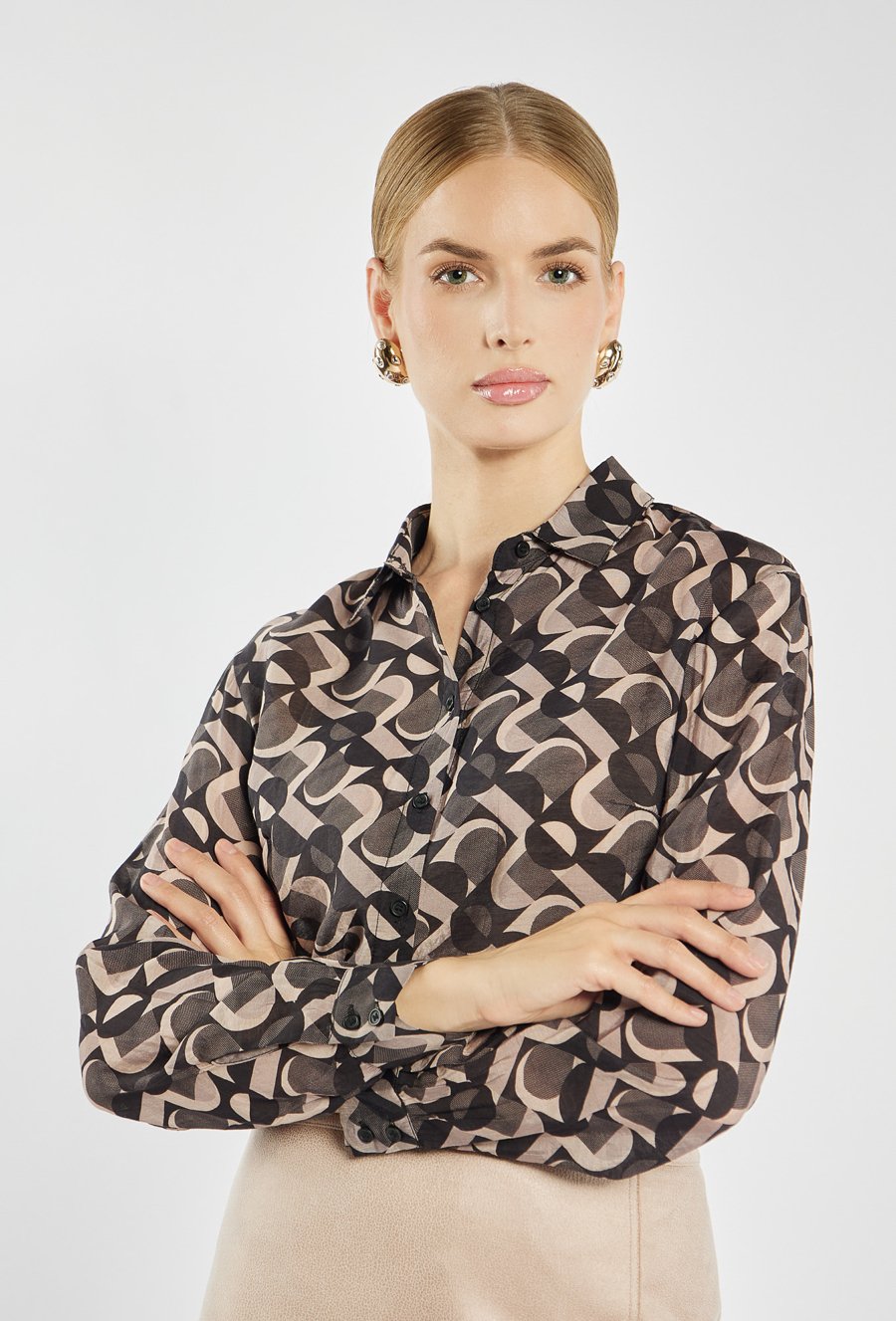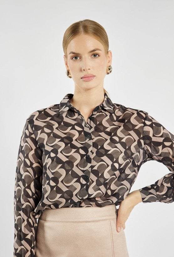 Koszula damska o klasycznym fasonie, zapinana na guziki. Model z kołnierzykiem i długim rękawem zakończonym mankietem na guziki. Idealna do eleganckich i casualowych stylizacji, nadaje całości kobiecego i oryginalnego charakteru. Modelka na zdjęciu ma 177 cm wzrostu i prezentuje rozmiar 36.