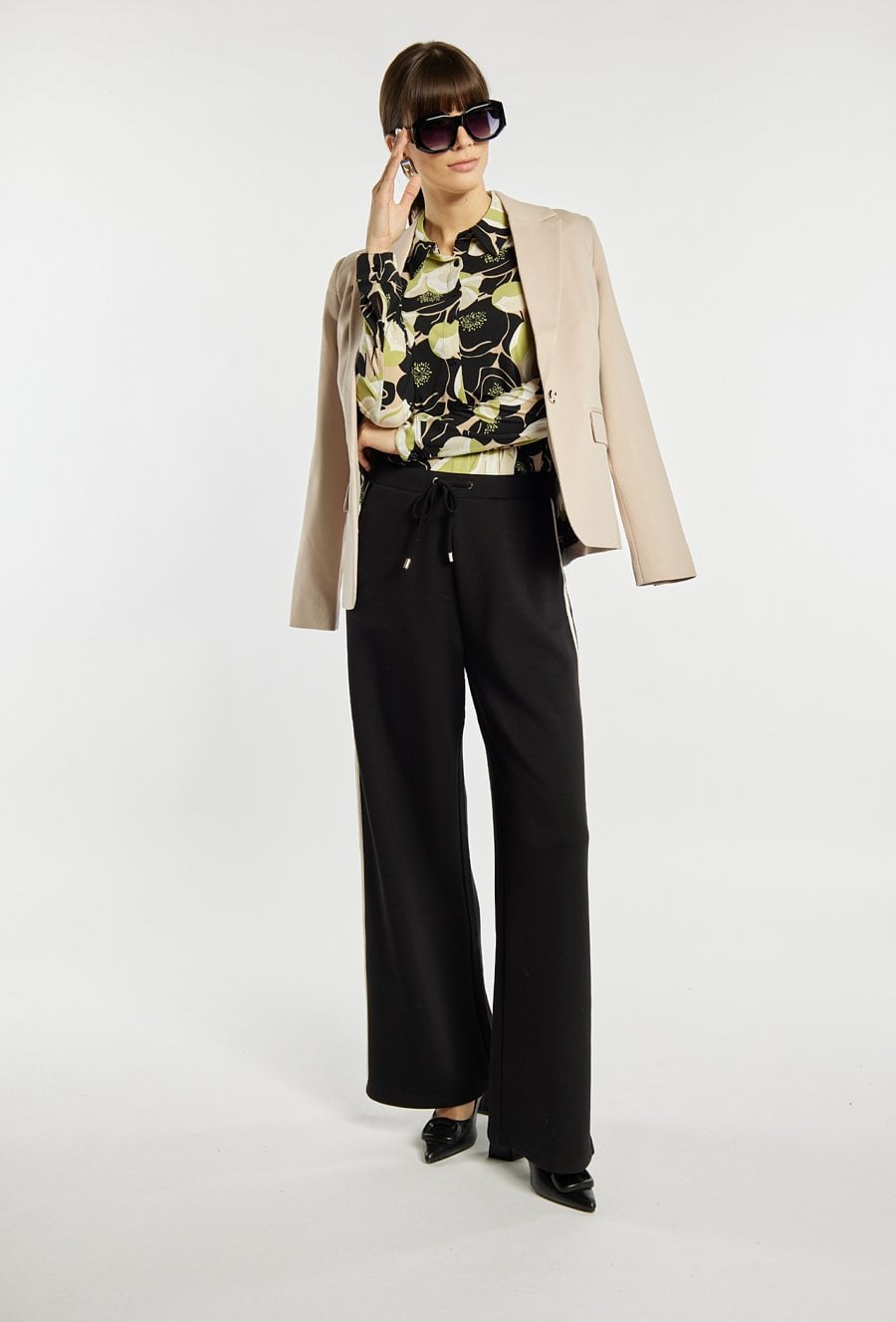 Koszula damska o klasycznym, dopasowanym kroju z wyrazistym printem. Koszula ma długie rękawy, kołnierzyk oraz zapięcie na guziki na całej długości. Koszula świetnie sprawdzi się zarówno w codziennych, jak i bardziej eleganckich stylizacjach. Modelka na zdjęciu ma 177 cm wzrostu i prezentuje rozmiar S.