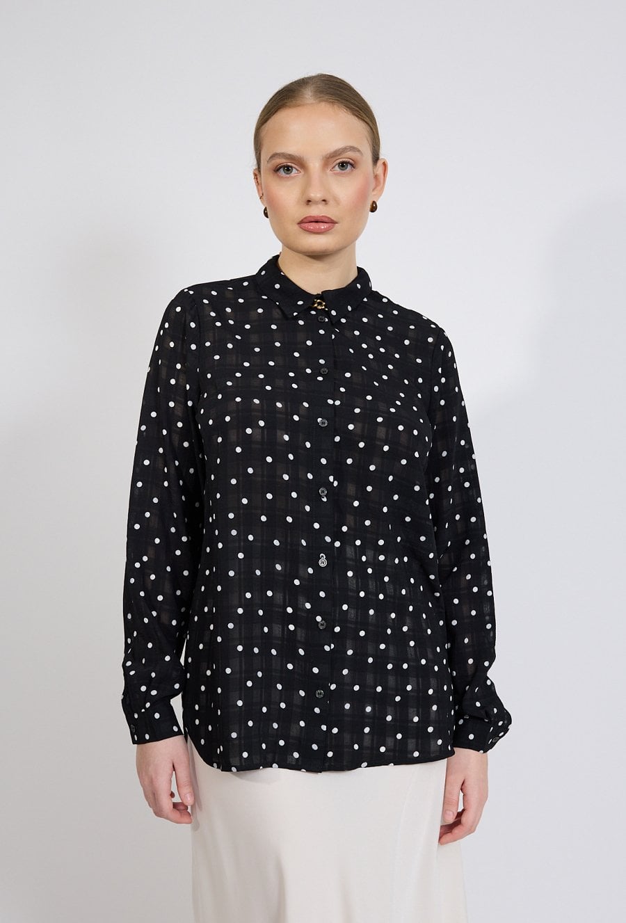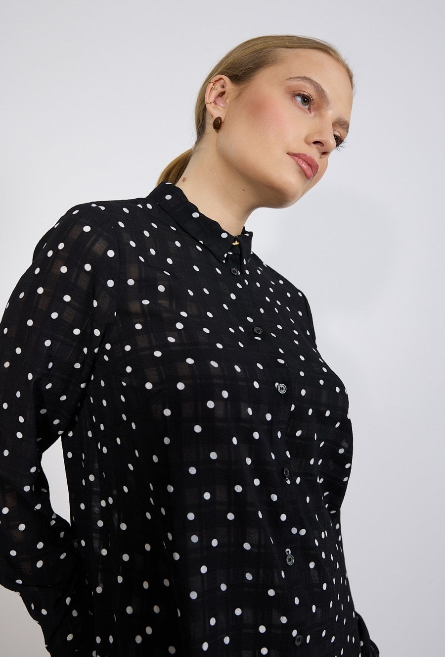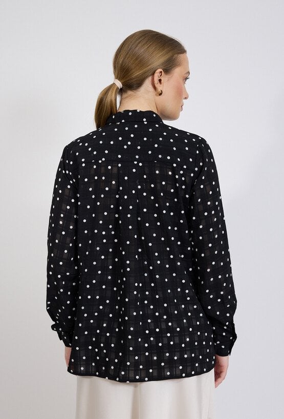 Koszula damska o klasycznym, eleganckim kroju. Model z długim rękawem zakończonym mankietem oraz kołnierzykiem, zapinany na guziki. Lekka, półtransparentna tkanina zdobiona wzorem w kropki nadaje całości kobiecego i stylowego charakteru. Modelka na zdjęciu ma 177 cm wzrostu i prezentuje rozmiar 36.