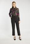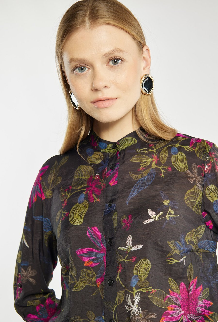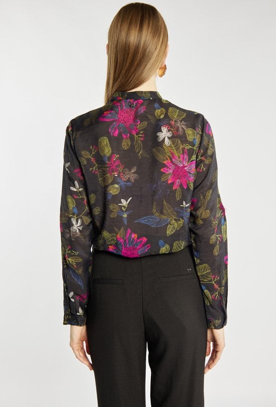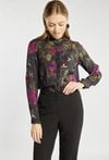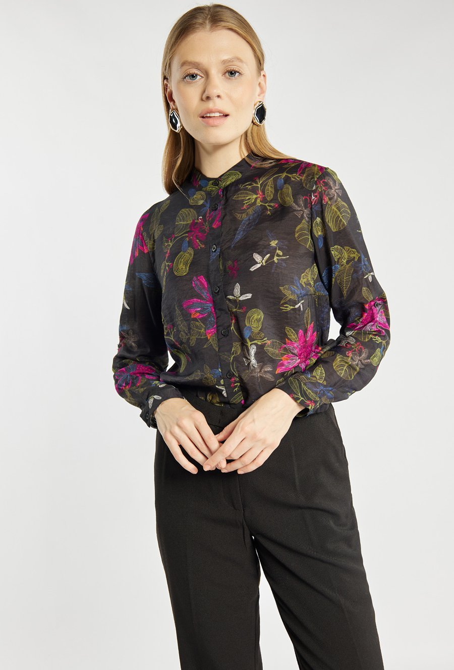 Koszula damska o klasycznym kroju, zapinana na guziki. Koszula z długim rękawem i mankietami na guziki. Model w efektowny, kolorowy wzór roślinny, który dodaje całości elegancji i oryginalnego charakteru. Idealna propozycja zarówno do pracy, jak i na wieczorne wyjścia. Modelka na zdjęciu ma 177 cm wzrostu i prezentuje rozmiar 36.