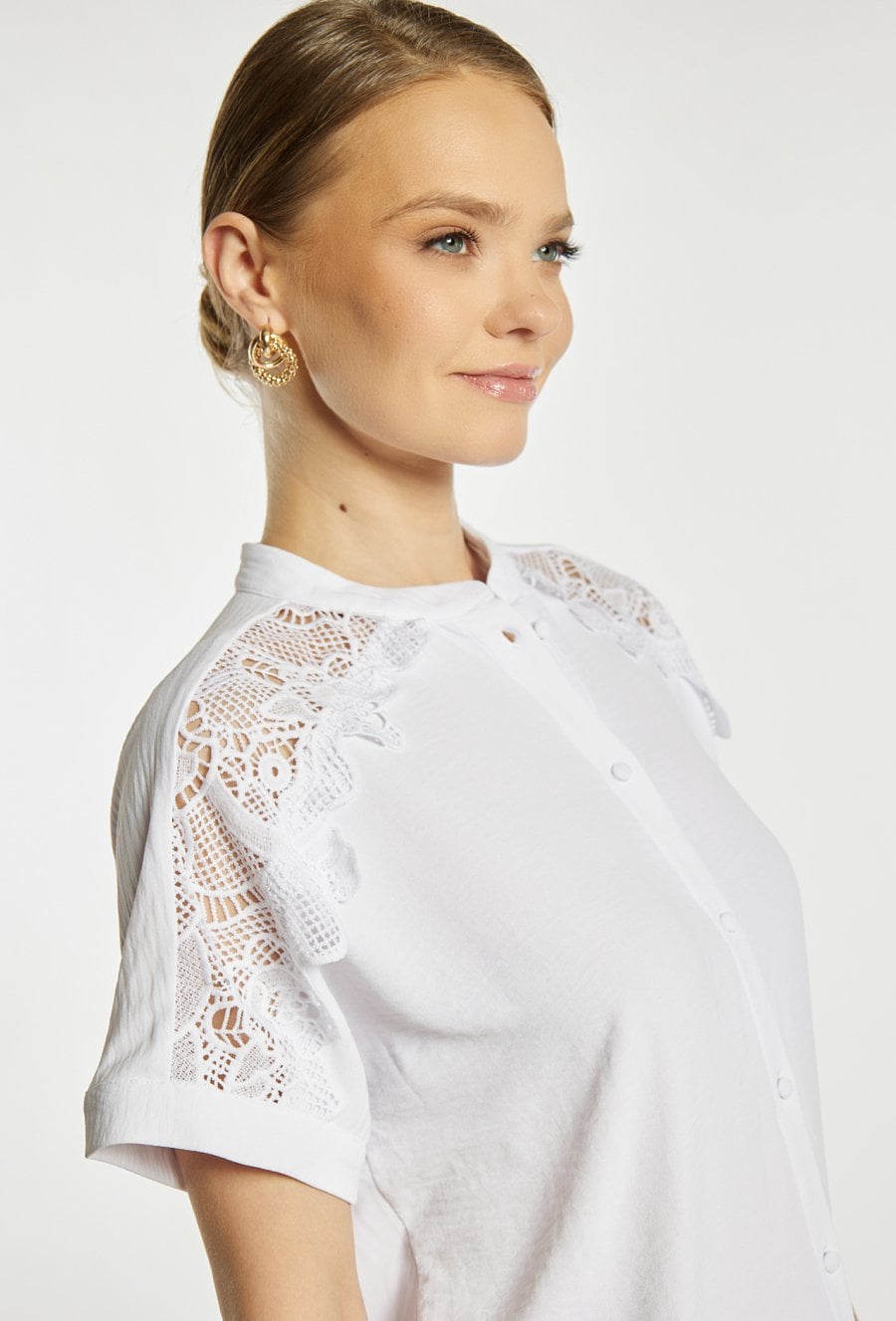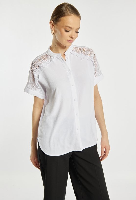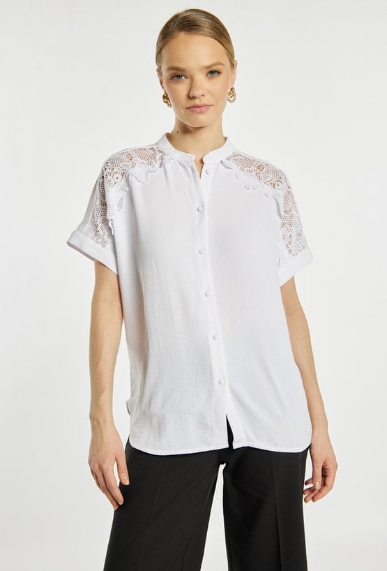 Koszula damska o prostym, eleganckim kroju. Model z krótkim rękawem, stójką oraz zapięciem na guziki na całej długości. Górną część zdobią subtelne, koronkowe wstawki, które nadają całości lekkiego i kobiecego charakteru. Bluzka doskonale sprawdzi się w stylizacjach biurowych oraz na co dzień. Modelka na zdjęciu ma 177 cm wzrostu i prezentuje rozmiar S.