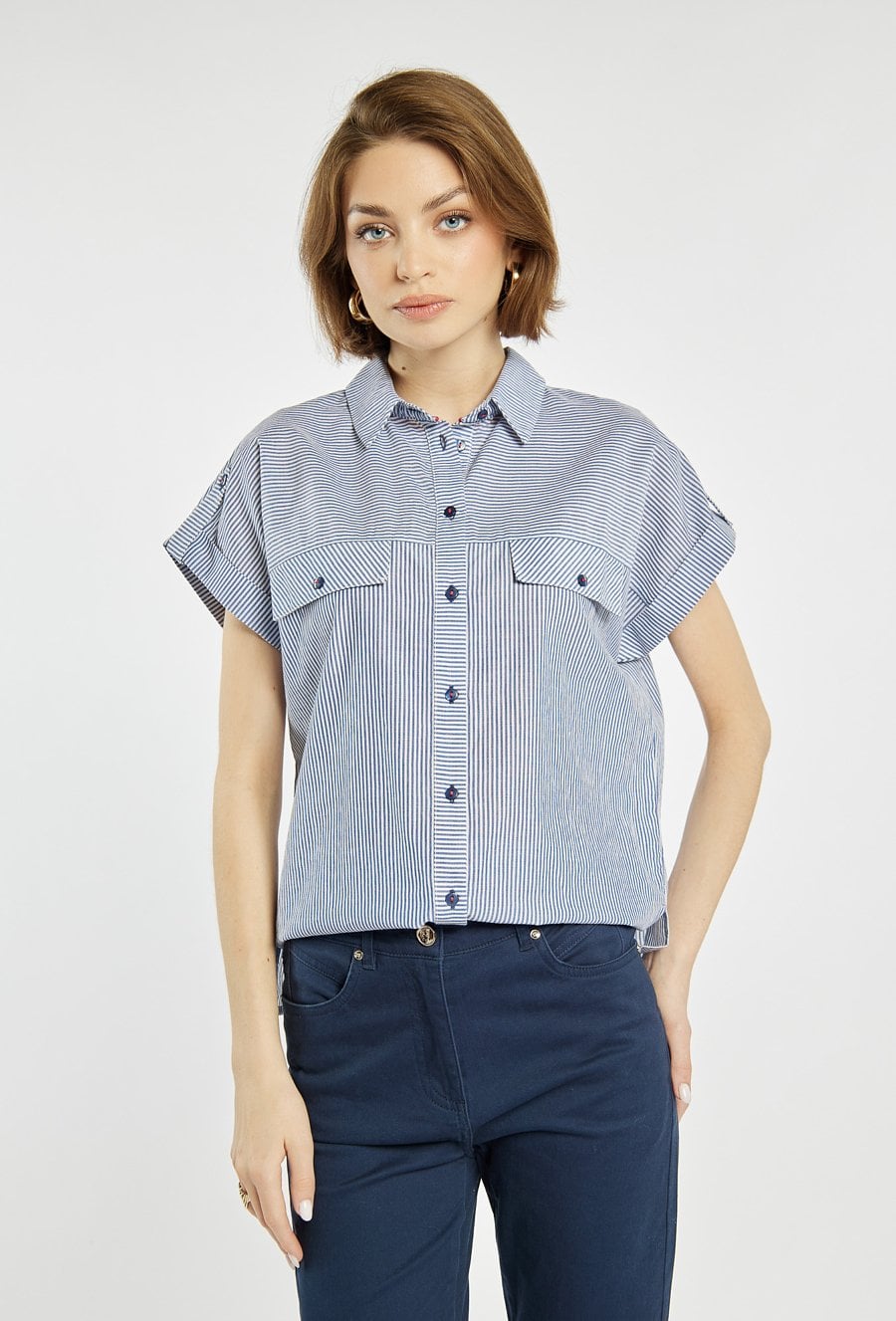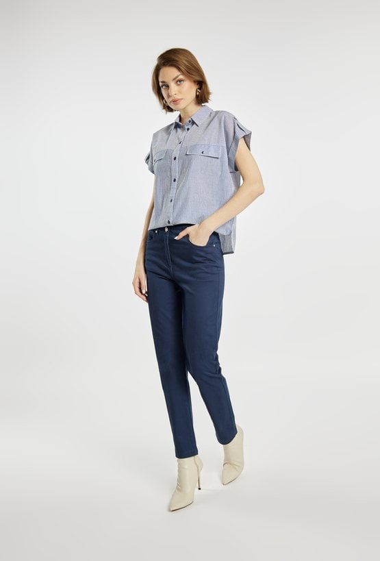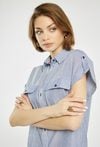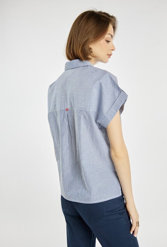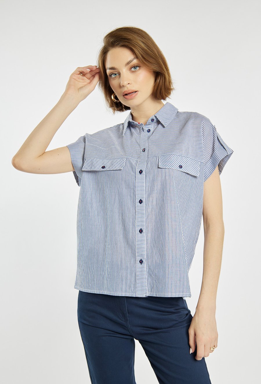 Koszula z krótkim rękawem i klasycznym kołnierzykiem. Koszula z zapięciem na guziki oraz efektownymi kieszeniami z patkami na piersi łączy w sobie wygodę i nowoczesny styl. Delikatny wzór w paski dodaje całości lekkości i świeżości. Modelka na zdjęciu ma 177 cm wzrostu i prezentuje rozmiar 36.