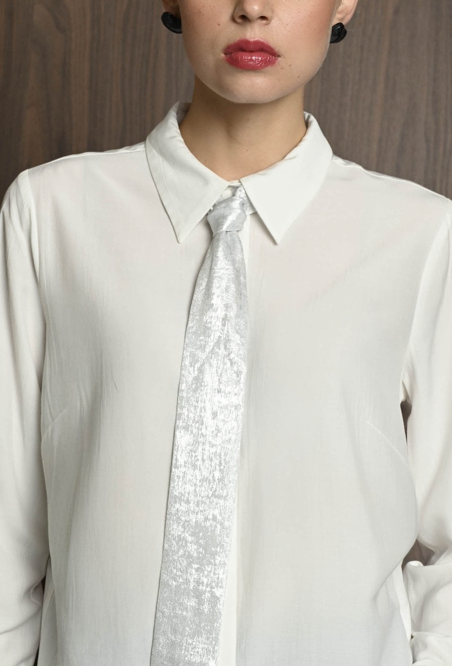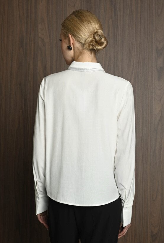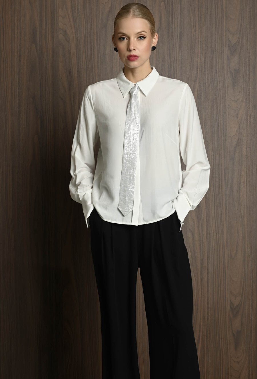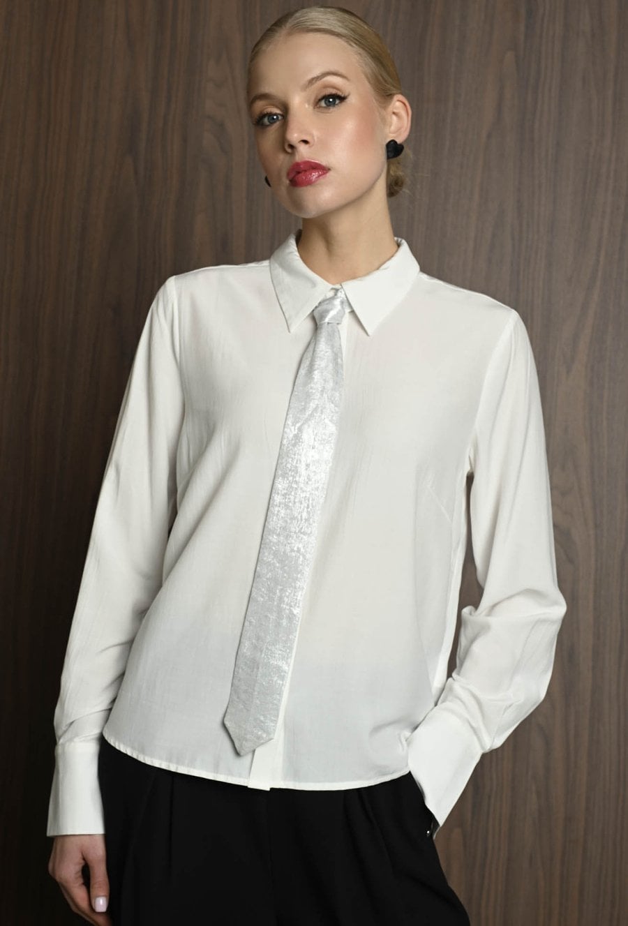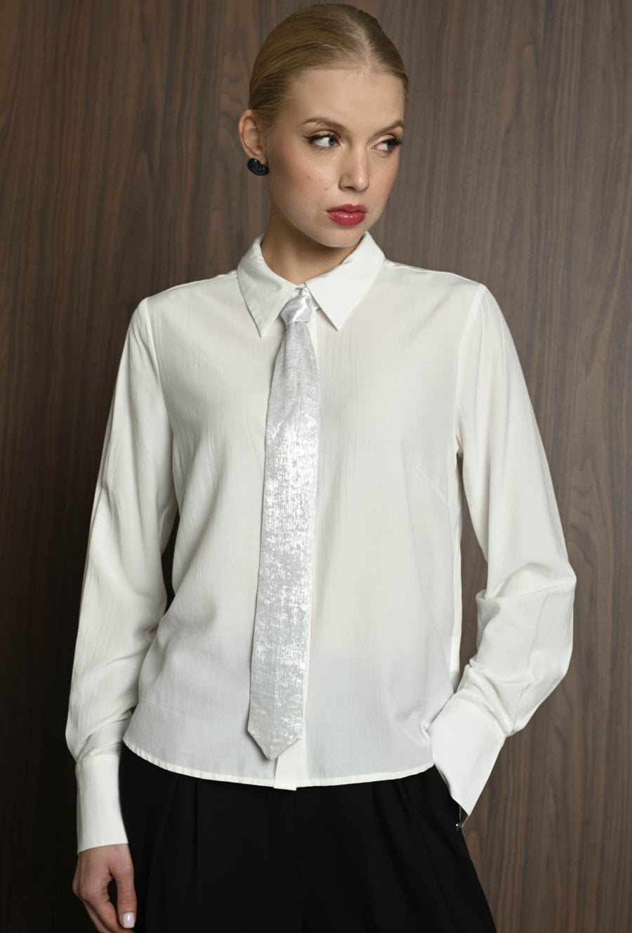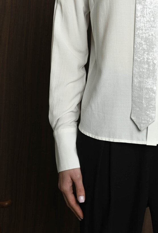Koszula damska w neutralnym kolorze, z szerokimi mankietami zapinanymi na guziki. Uwagę przyciąga krawat ozdobny, który dodaje całości eleganckiego i nieco błyszczącego akcentu. Koszula świetnie sprawdzi się jako baza stylizacji – ma klasyczny fason, ale dzięki połyskującemu detalowi staje się wyjątkowa. Można ją nosić zarówno do prostych spodni, jak i spódnicy, tworząc stylowy, ale stonowany look z nutą oryginalności. Modelka na zdjęciu ma 177 cm wzrostu i prezentuje rozmiar 36.