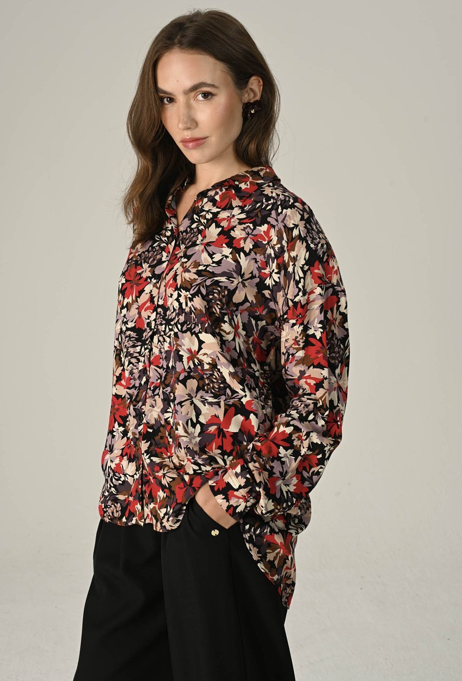 Klasyczna koszula z miękkiej, przewiewnej wiskozy to połączenie wygody i stylu w nowoczesnym wydaniu. Długi rękaw z mankietem, kołnierzyk oraz guziki na całej długości podkreślają jej ponadczasowy fason. Dostępna w dwóch wersjach — gładkiej i z wyrazistym printem — pozwala wybrać między minimalizmem a mocnym akcentem. Modelka na zdjęciu ma 177 cm wzrostu i prezentuje rozmiar 36.