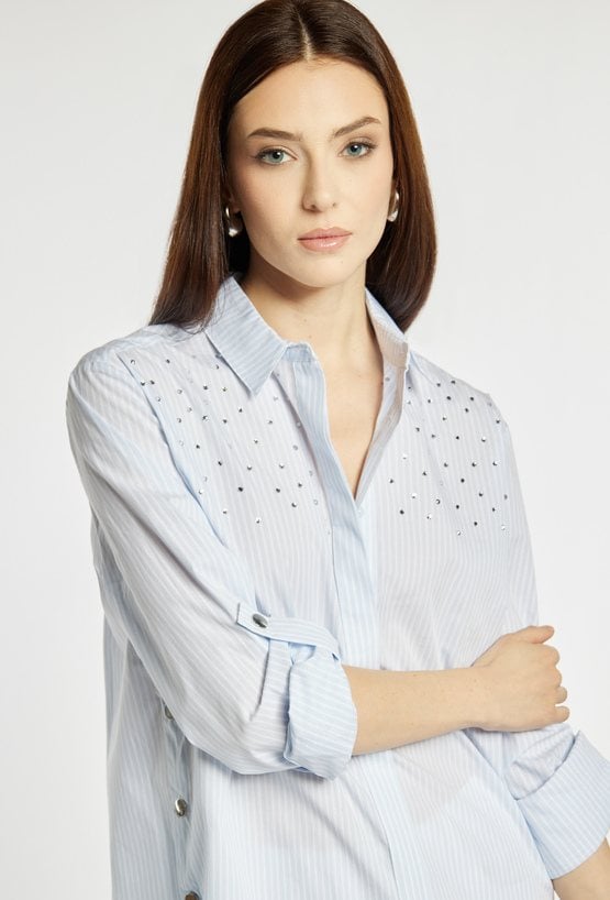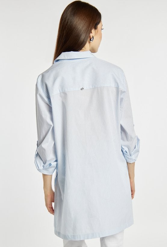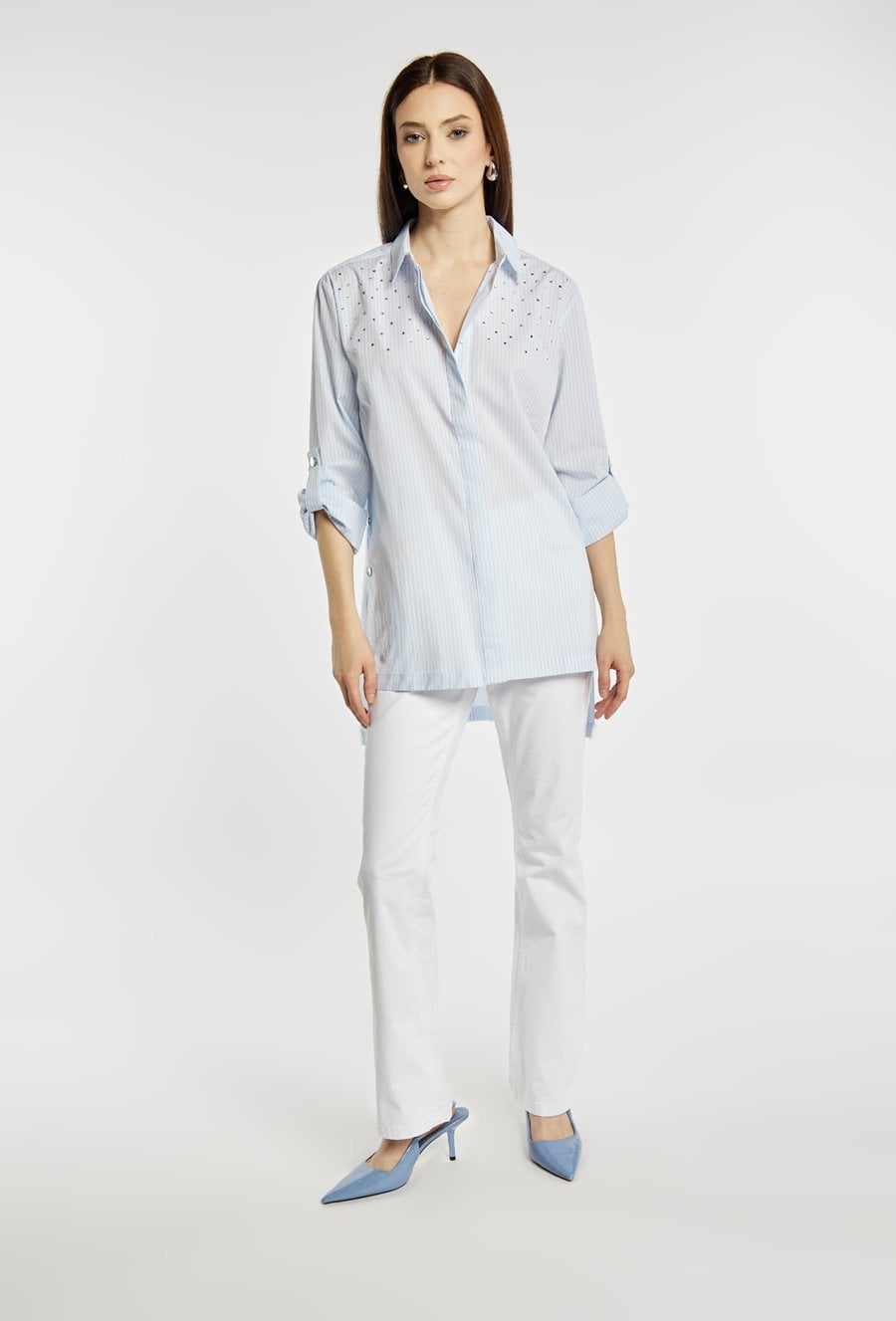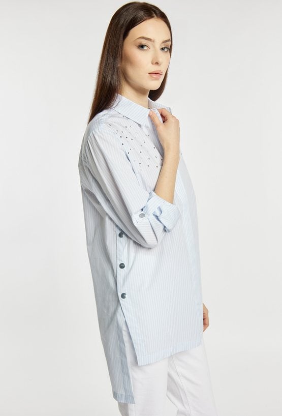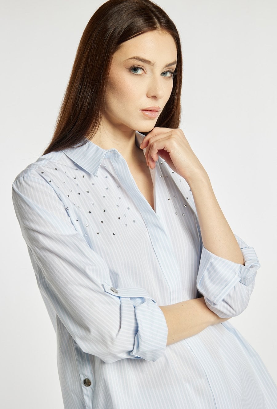 Koszula damska o lekko wydłużonym kroju z delikatnym, subtelnym zdobieniem w górnej części. Koszula ma klasyczny kołnierzyk, rękawy z możliwością podpięcia oraz rozcięcia po bokach zapinane na napy, które dodają jej nowoczesnego charakteru. Koszula świetnie sprawdzi się w codziennych i bardziej eleganckich stylizacjach. Modelka na zdjęciu ma 177 cm wzrostu i prezentuje rozmiar 36.
