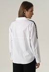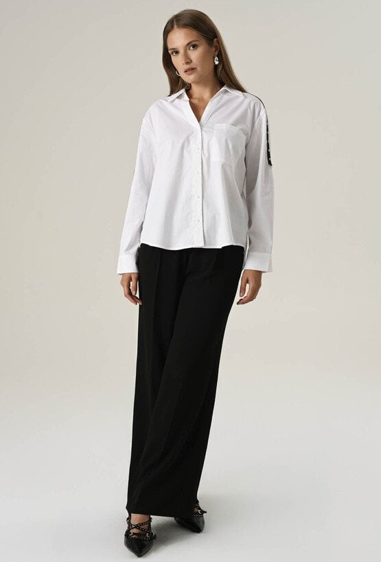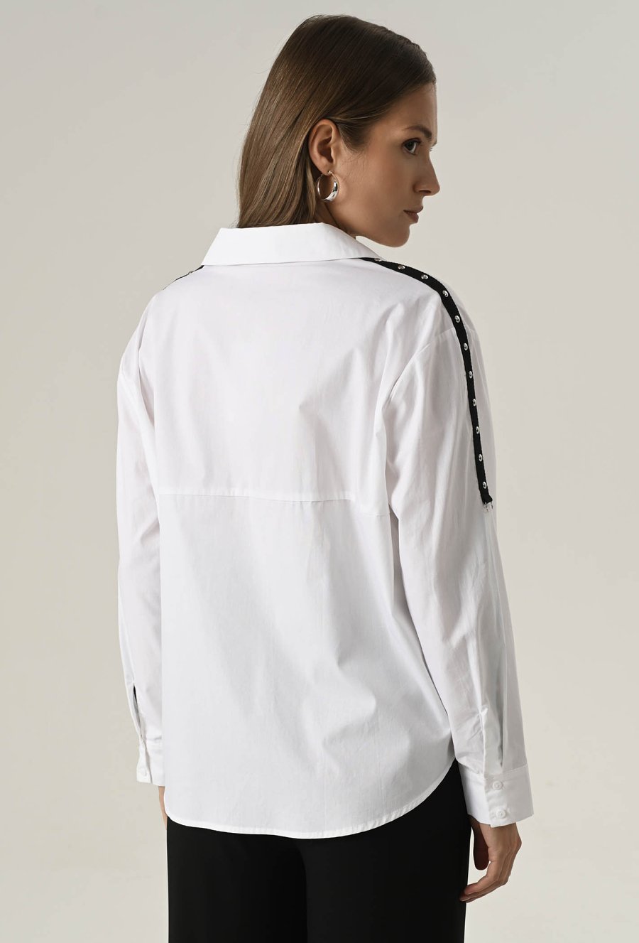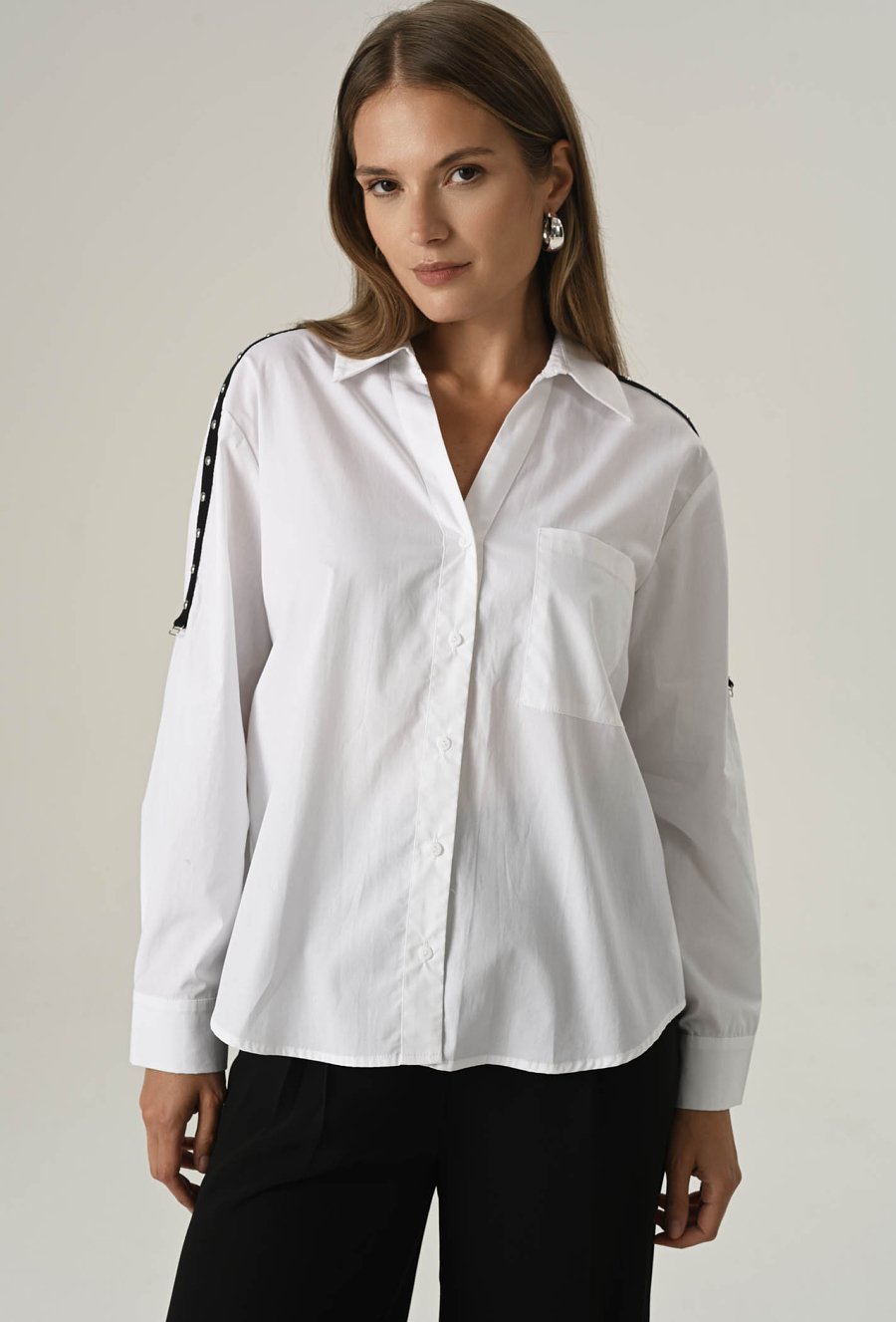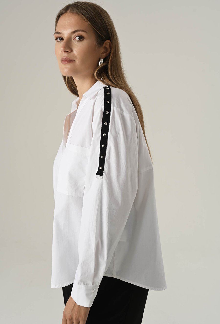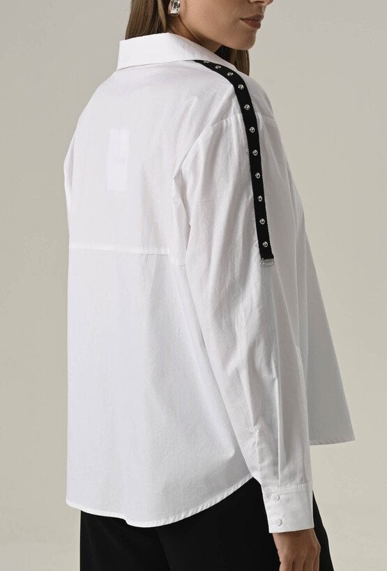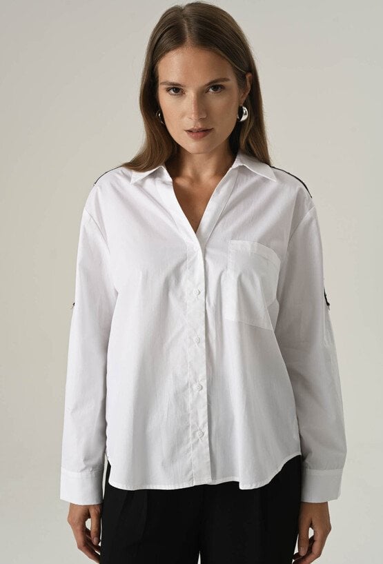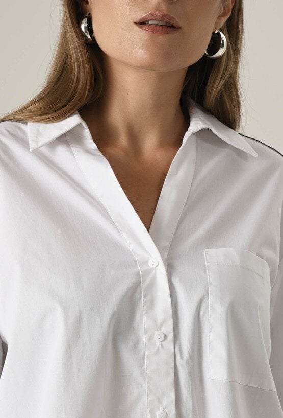 Ta koszula to połączenie luźniejszego kroju z detalami, które przyciągają uwagę. Lekki oversize zapewnia swobodę ruchów i komfort noszenia przez cały dzień. Model zapinany na guziki, z klasycznym kołnierzem w błękitnym kolorze. Ten model sprawdzi się zarówno do pracy, jak i na co dzień. Na ramionach znajdują się ozdobne paski, które pełnią również funkcję praktyczną – umożliwiają regulację długości rękawa. To uniwersalny element garderoby, który sprawdzi się w wielu stylizacjach – od casualowych po bardziej eleganckie. Modelka na zdjęciu ma 177 cm wzrostu i prezentuje rozmiar 36/S.