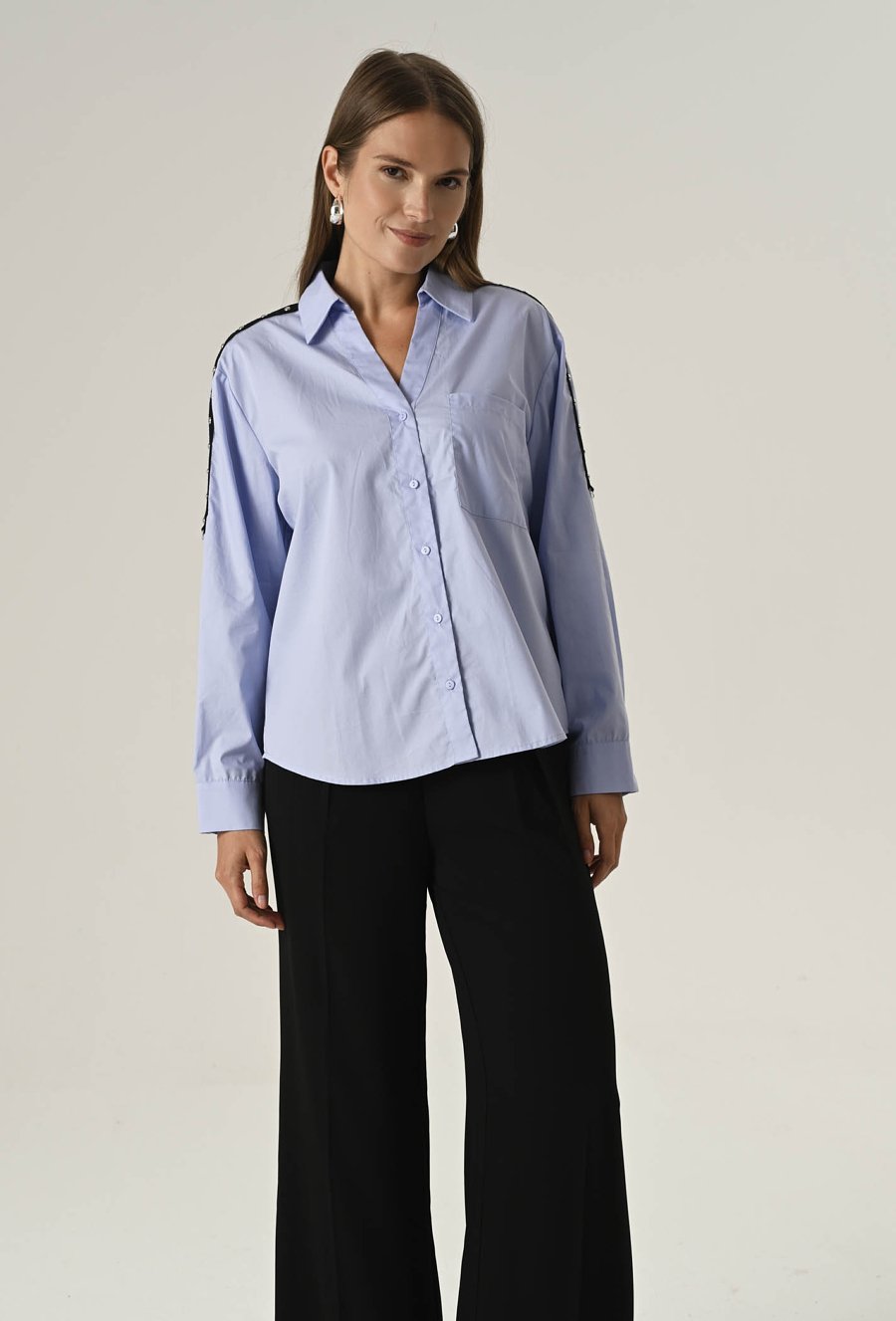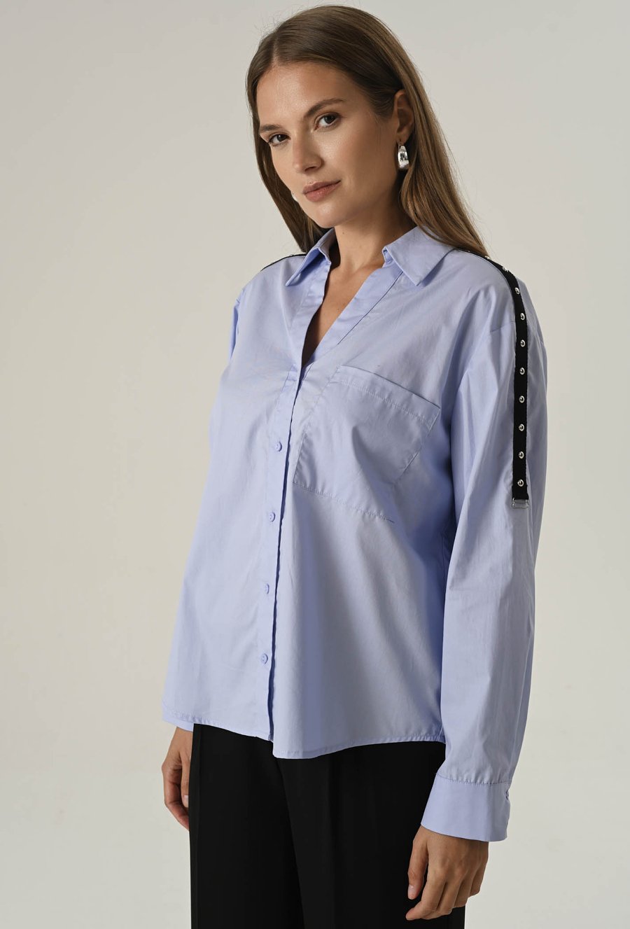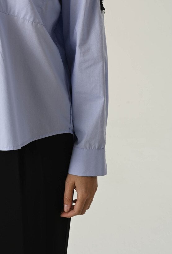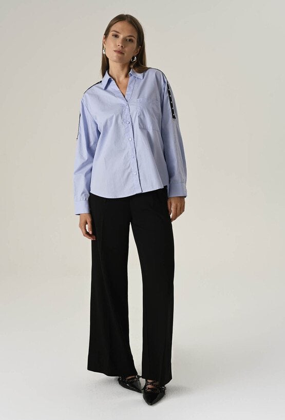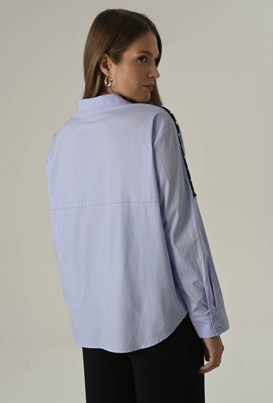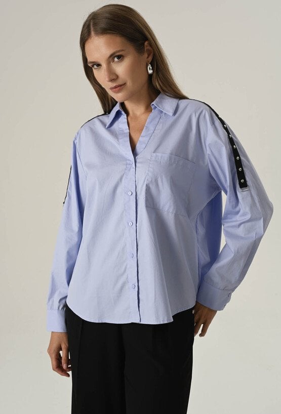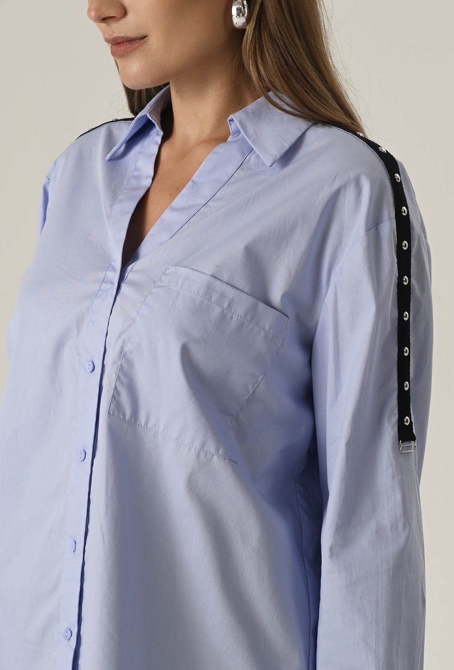 Ta koszula to połączenie luźniejszego kroju z detalami, które przyciągają uwagę. Lekki oversize zapewnia swobodę ruchów i komfort noszenia przez cały dzień. Model zapinany na guziki, z klasycznym kołnierzem w błękitnym kolorze. Ten model sprawdzi się zarówno do pracy, jak i na co dzień. Na ramionach znajdują się ozdobne paski, które pełnią również funkcję praktyczną – umożliwiają regulację długości rękawa. To uniwersalny element garderoby, który sprawdzi się w wielu stylizacjach – od casualowych po bardziej eleganckie. Modelka na zdjęciu ma 177 cm wzrostu i prezentuje rozmiar 36/S.