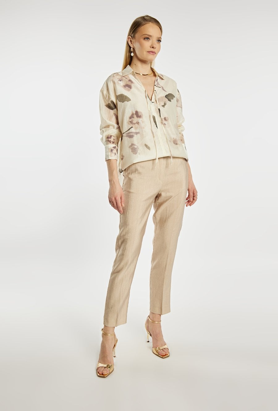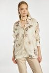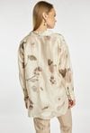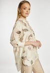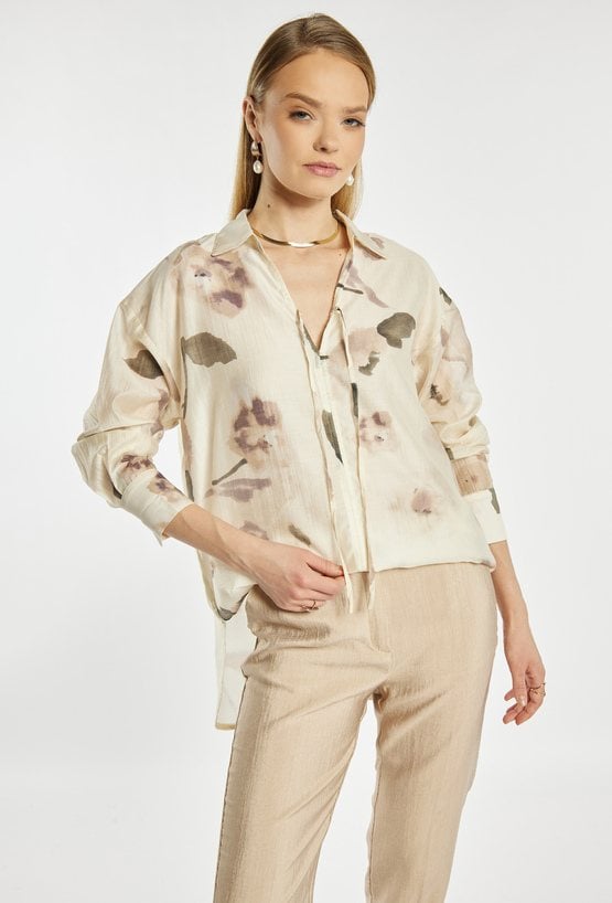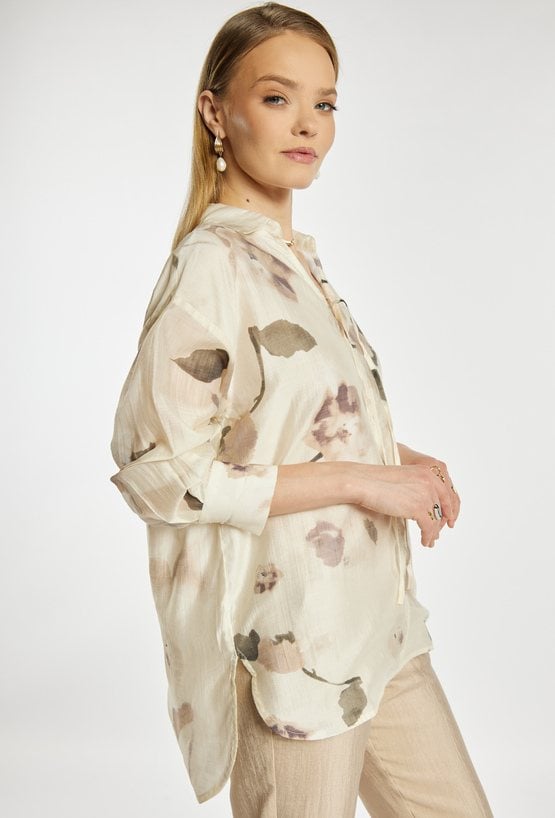 Koszula damska o swobodnym, lekko oversize’owym kroju. Model z klasycznym kołnierzykiem oraz zapięciem na guziki, które podkreśla jej ponadczasowy charakter. Długie rękawy z możliwością podwinięcia dodają stylizacji nonszalancji i lekkości. Całość zdobi subtelny, artystyczny wzór w stonowanej kolorystyce. Koszula pięknie układa się na sylwetce i doskonale sprawdzi się zarówno w codziennych stylizacjach, jak i w bardziej eleganckich zestawach. Modelka na zdjęciu ma 177 cm wzrostu i prezentuje rozmiar S/M.