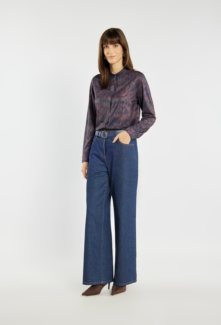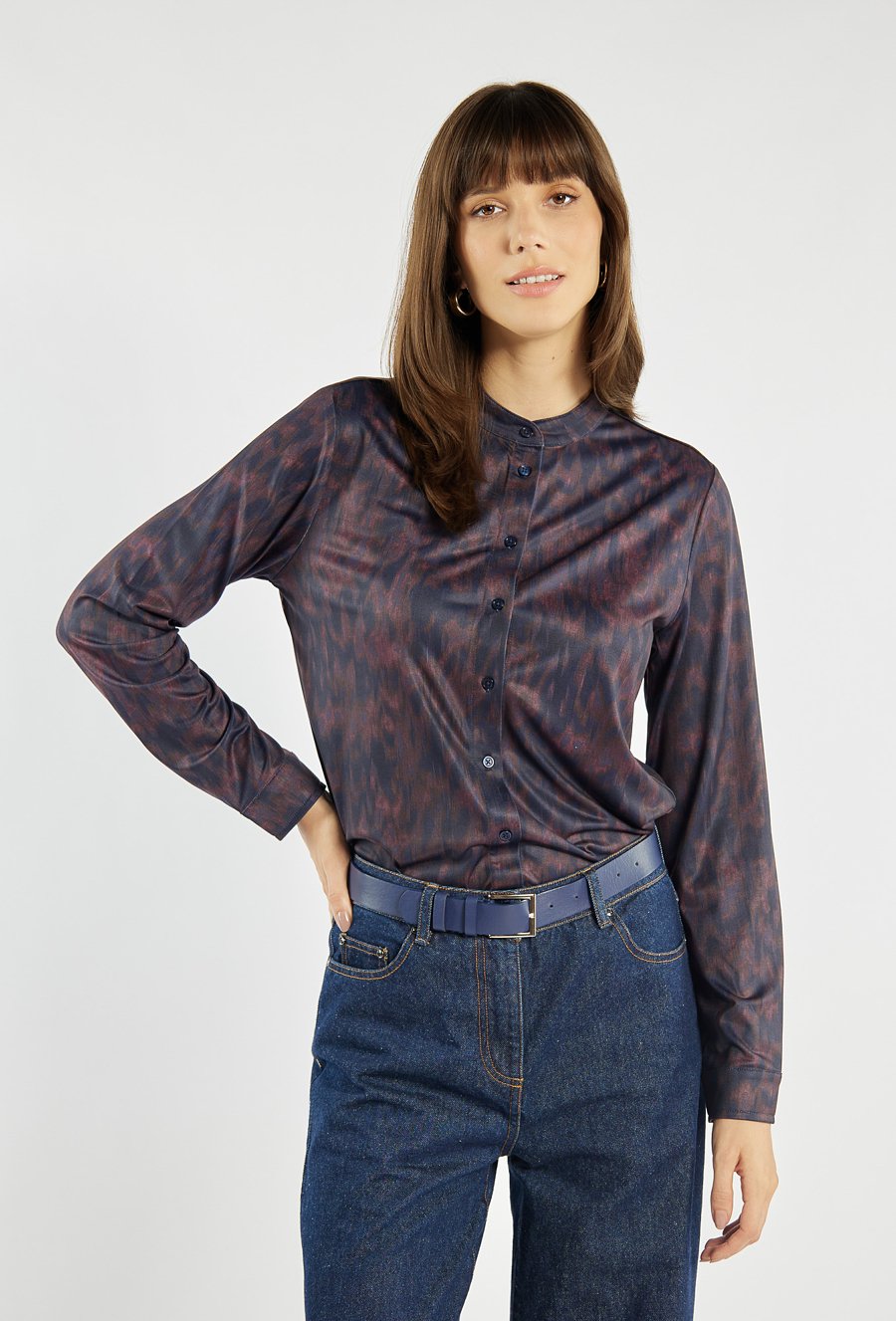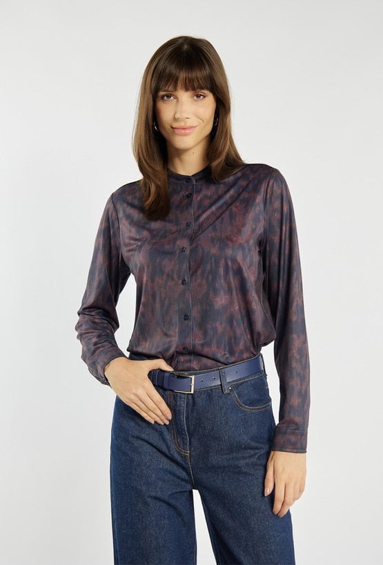 Koszula damska z długim rękawem i klasycznym zapięciem na guziki. Model o prostym kroju, wykończony stójką. Stylowa i wygodna propozycja na co dzień oraz do bardziej eleganckich zestawień. Modelka na zdjęciu ma 177 cm wzrostu i prezentuje rozmiar S.