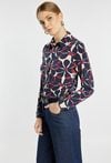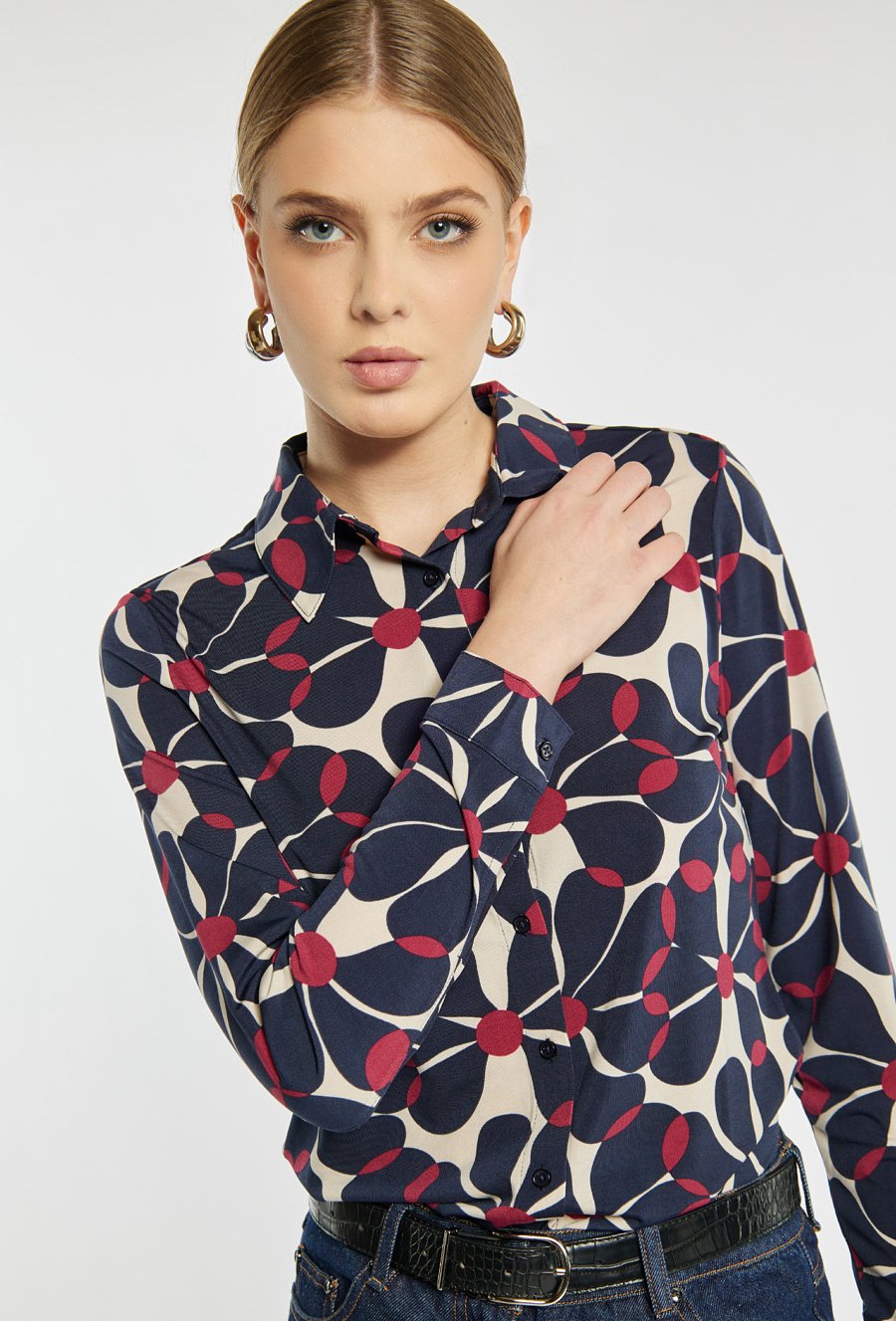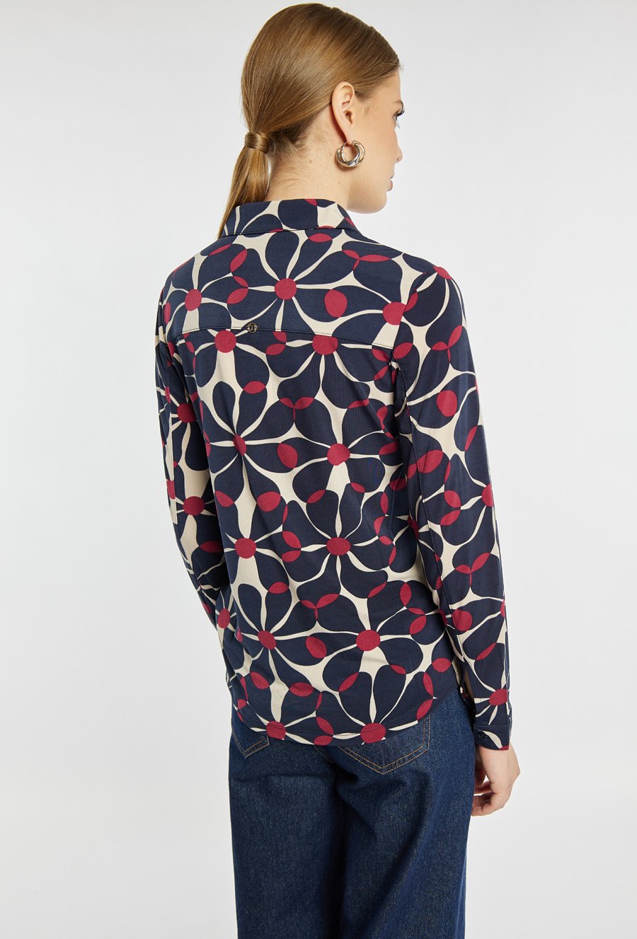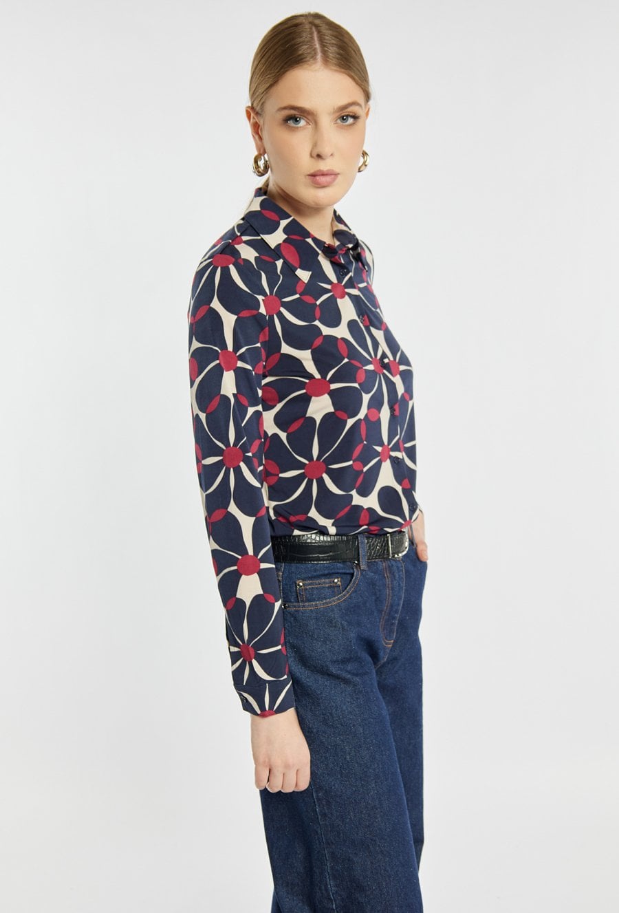 Koszula o eleganckim, kobiecym charakterze, wykonana z lekkiego materiału z wyrazistym, kontrastowym nadrukiem. Koszula ma klasyczny kołnierzyk, długie rękawy oraz prosty fason, który dobrze układa się na sylwetce. Model sprawdzi się zarówno w stylizacjach biurowych, jak i bardziej casualowych. Modelka na zdjęciu ma 177 cm wzrostu i prezentuje rozmiar S.
