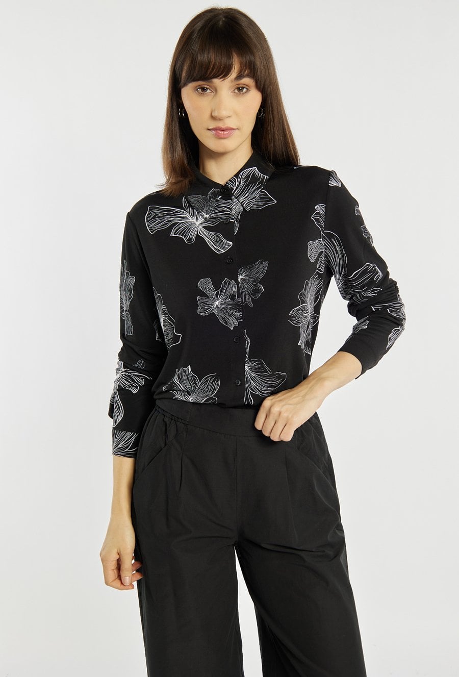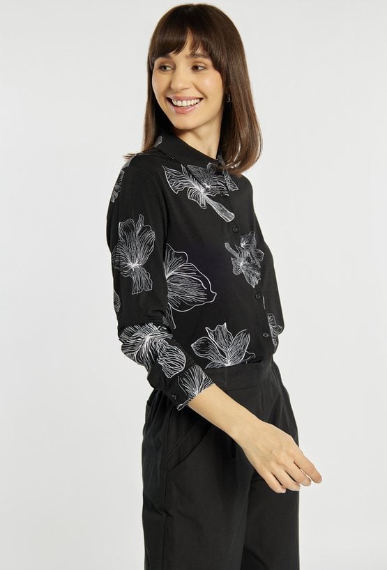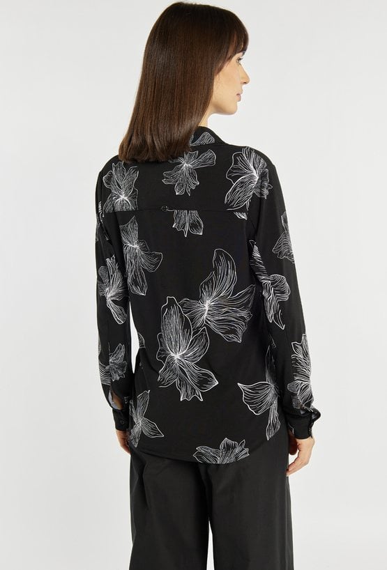 Koszula o eleganckim, kobiecym charakterze, wykonana z lekkiego materiału z wyrazistym, kontrastowym nadrukiem. Koszula ma klasyczny kołnierzyk, długie rękawy oraz prosty fason, który dobrze układa się na sylwetce. Model sprawdzi się zarówno w stylizacjach biurowych, jak i bardziej casualowych. Modelka na zdjęciu ma 177 cm wzrostu i prezentuje rozmiar S.