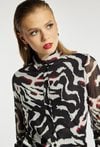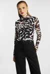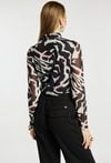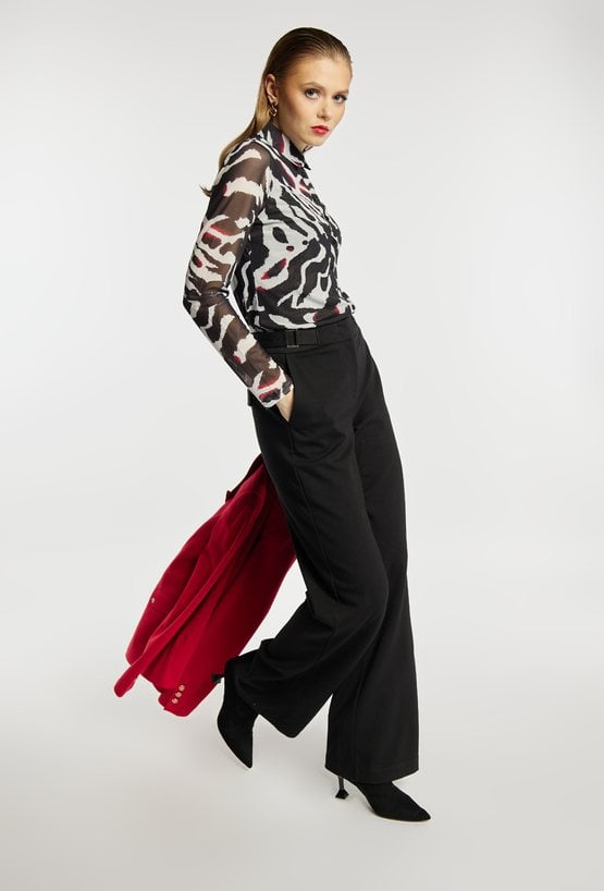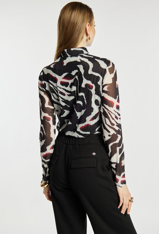 Koszula z długimi rękawami i kołnierzykiem. Koszula wykonana z lekkiego, półtransparentnego materiału, zapinana na guziki i ozdobiona dużym wzorem. Koszula idealnie sprawdzi się do wiosennych stylizacji. Modelka na zdjęciu ma 177 cm wzrostu i prezentuje rozmiar S.