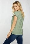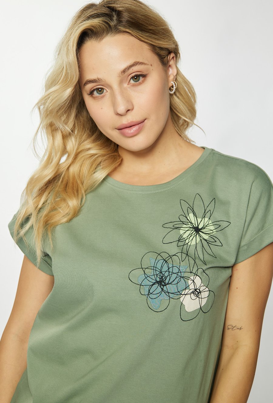 Bawełniany t-shirt damski z wzorem kwiatów. T-shirt z krótkimi rękawami, półokrągłym dekoltem oraz wiązaniem u dołu. Model ten z pewnością sprawdzi się jako baza do codziennych stylizacji. Modelka na zdjęciu ma 177 cm wzrostu i prezentuje rozmiar 36.
