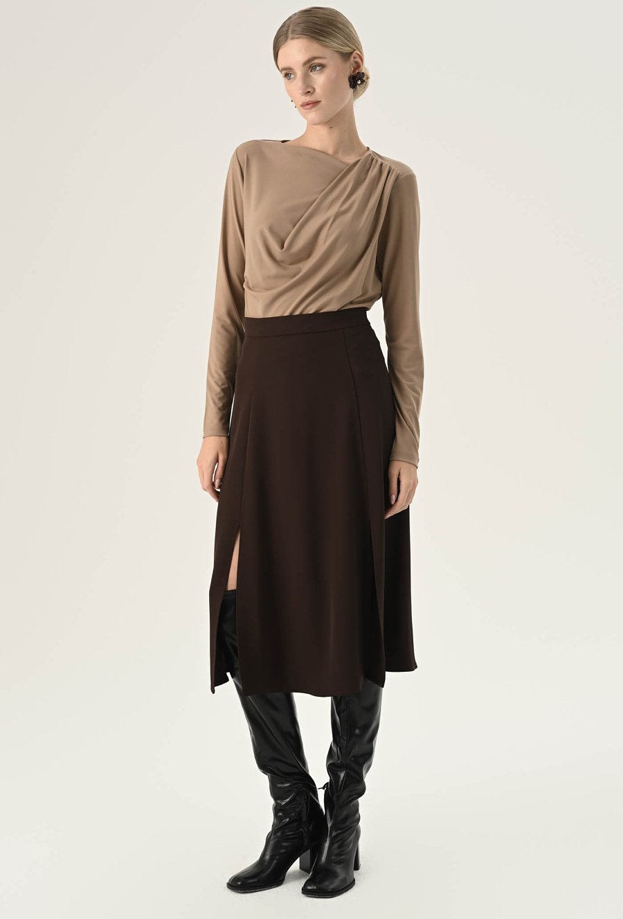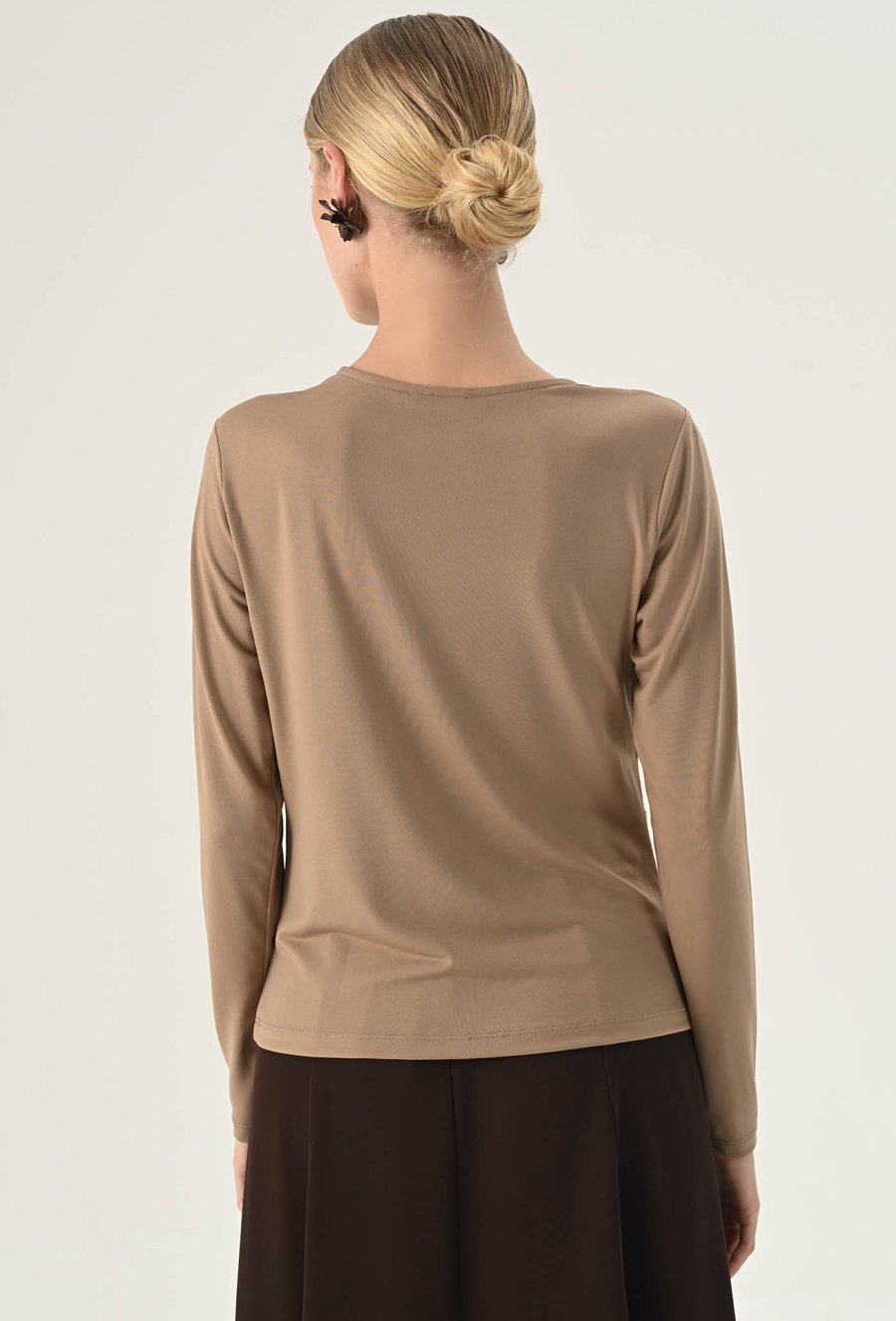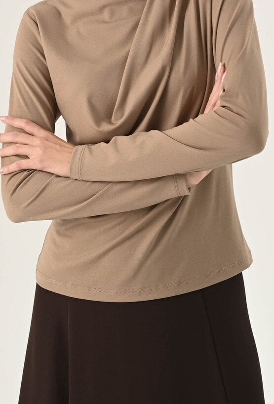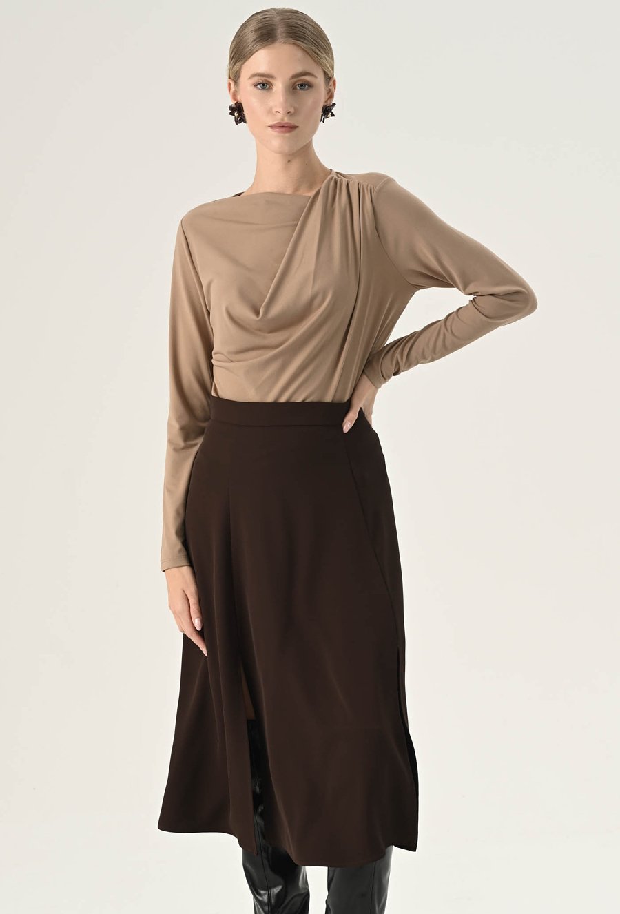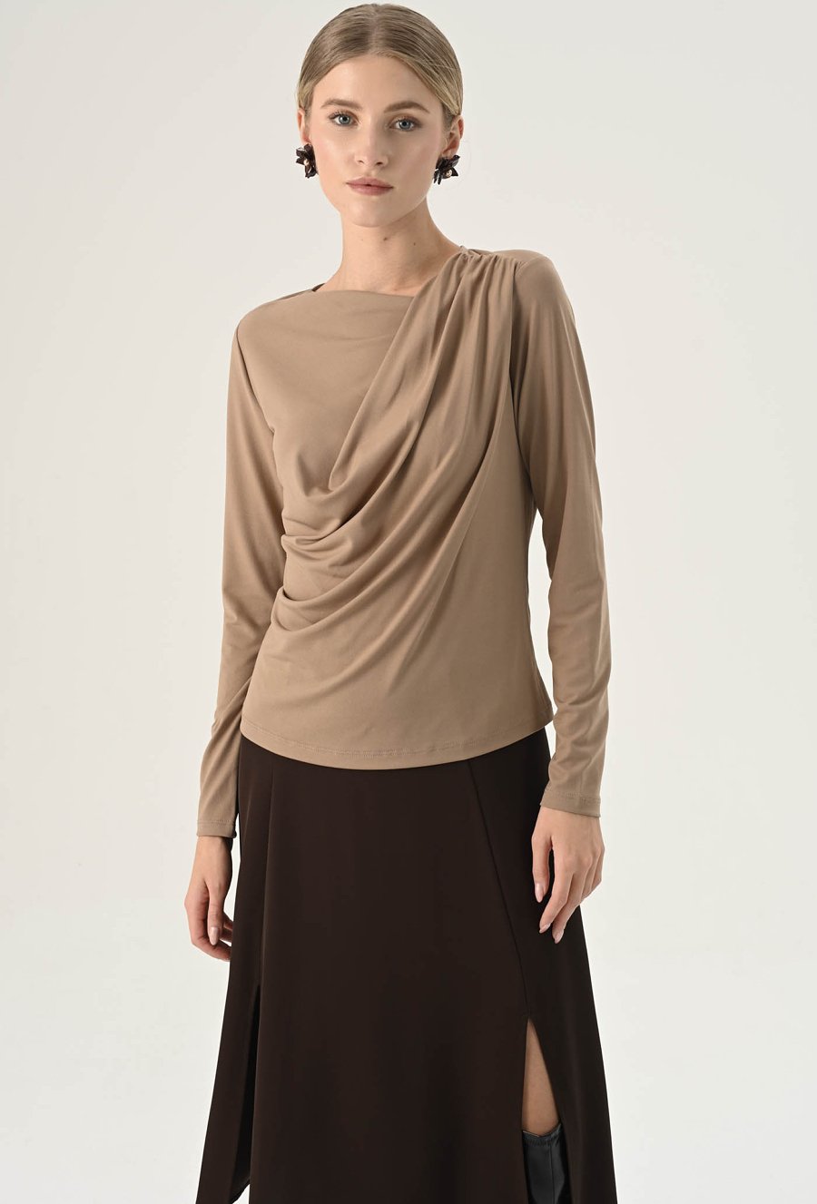 Stylowa i nowoczesna bluzka o asymetrycznym kroju, która przyciąga uwagę nietypowym ułożeniem materiału. Wykonana z elastycznej, miękko układającej się dzianiny, pięknie dopasowuje się do sylwetki, podkreślając jej kształt. Charakterystyczne drapowanie z przodu i przesunięty dekolt nadają całości oryginalny, lekko awangardowy charakter. Bluzka sprawdzi się zarówno w codziennych, jak i bardziej eleganckich stylizacjach – wystarczy dodać proste spodnie lub spódnicę, by stworzyć efektowny look. Modelka na zdjęciu ma 177 cm wzrostu i prezentuje rozmiar 36/S.