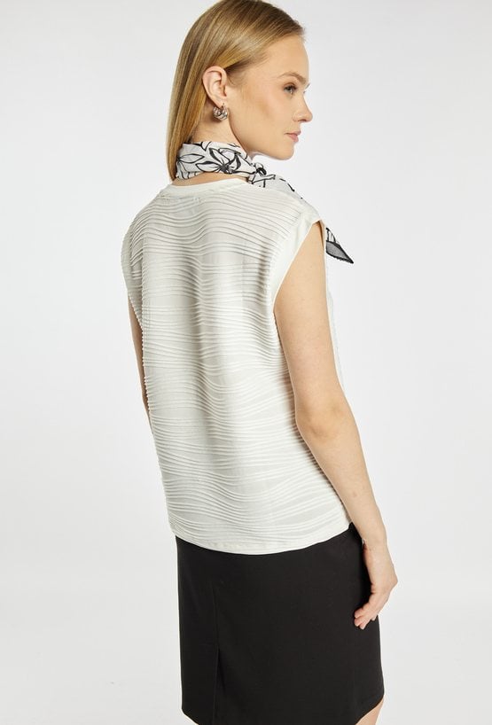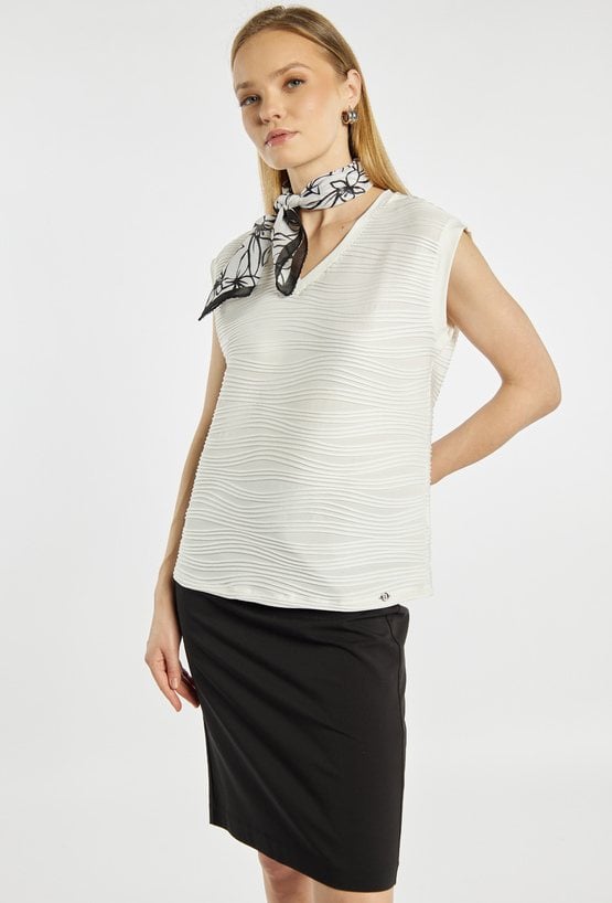 Bluzka o prostym, nowoczesnym kroju. Strukturalny materiał z wypukłym wzorem nadaje jej ciekawy, przestrzenny efekt i dodaje charakteru nawet przy minimalistycznej stylizacji. Dekolt w kształcie litery V subtelnie wysmukla sylwetkę, a całość świetnie sprawdza się zarówno w zestawach codziennych, jak i bardziej eleganckich. Modelka na zdjęciu ma 177 cm wzrostu i prezentuje rozmiar S.