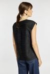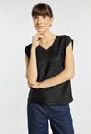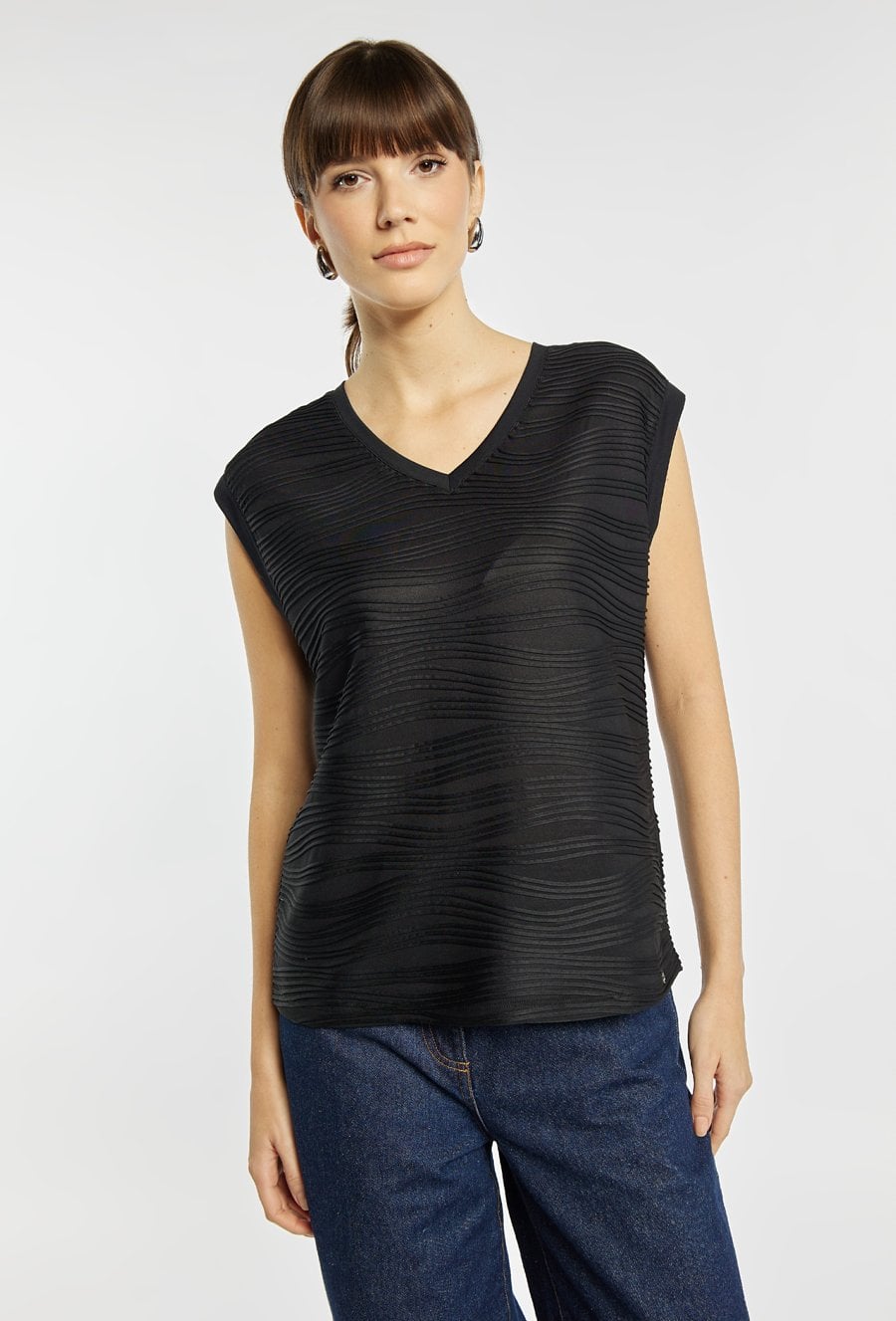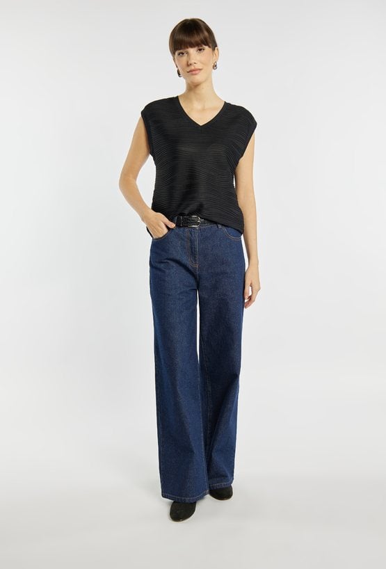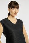 Bluzka o prostym, nowoczesnym kroju. Strukturalny materiał z wypukłym wzorem nadaje jej ciekawy, przestrzenny efekt i dodaje charakteru nawet przy minimalistycznej stylizacji. Dekolt w kształcie litery V subtelnie wysmukla sylwetkę, a całość świetnie sprawdza się zarówno w zestawach codziennych, jak i bardziej eleganckich. Modelka na zdjęciu ma 177 cm wzrostu i prezentuje rozmiar S.