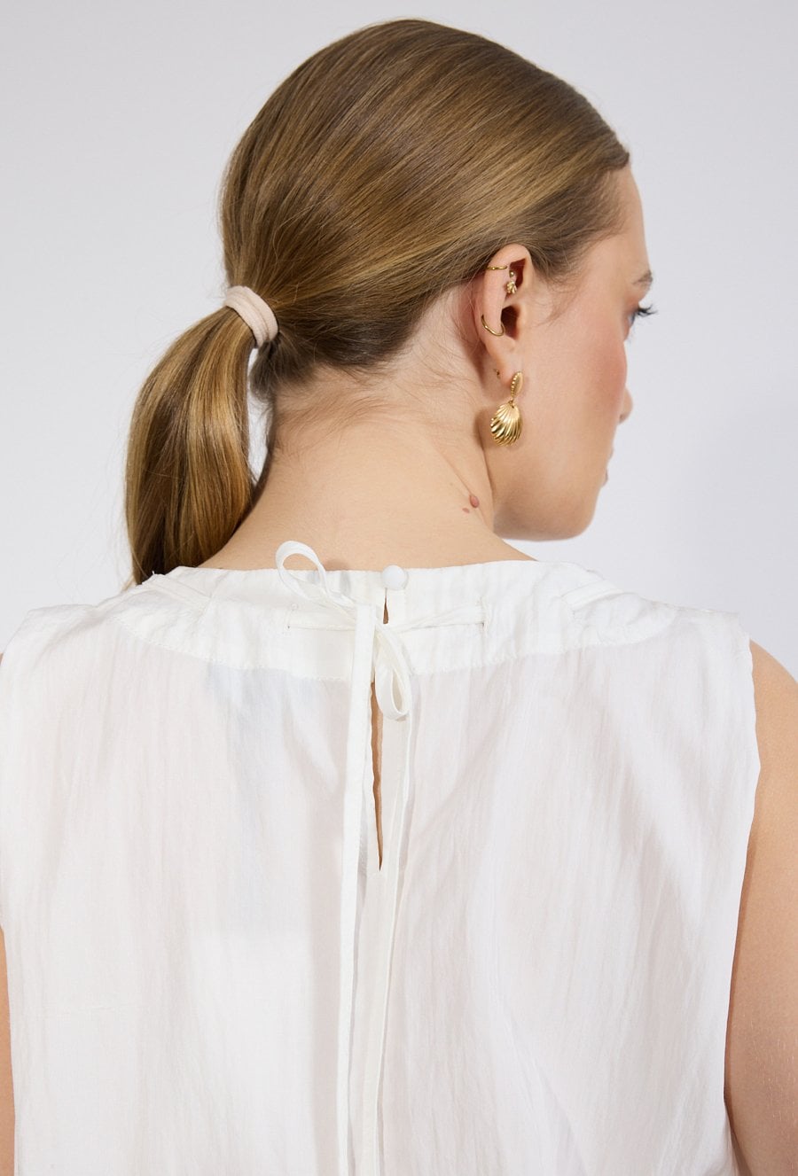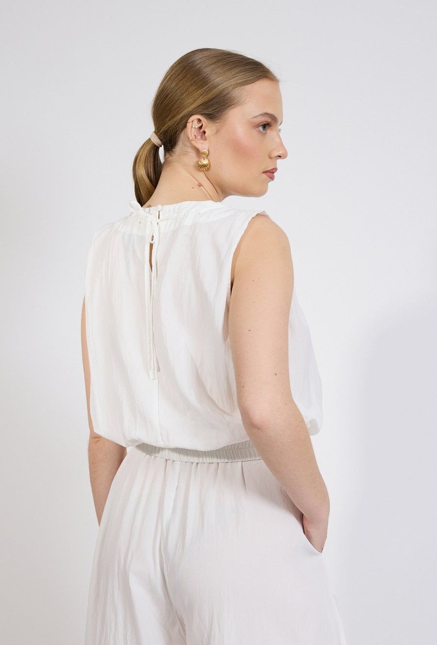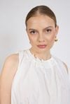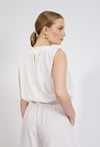 Bluzka damska o lekkim, kobiecym fasonie. Model bez rękawów z okrągłym dekoltem oraz efektownymi marszczeniami przy szyi, które nadają całości subtelnej objętości. Dół bluzki wykończony szerokim ściągaczem, dzięki czemu model pięknie układa się na sylwetce i zapewnia komfort noszenia. Modelka na zdjęciu ma 177 cm wzrostu i prezentuje rozmiar 36.