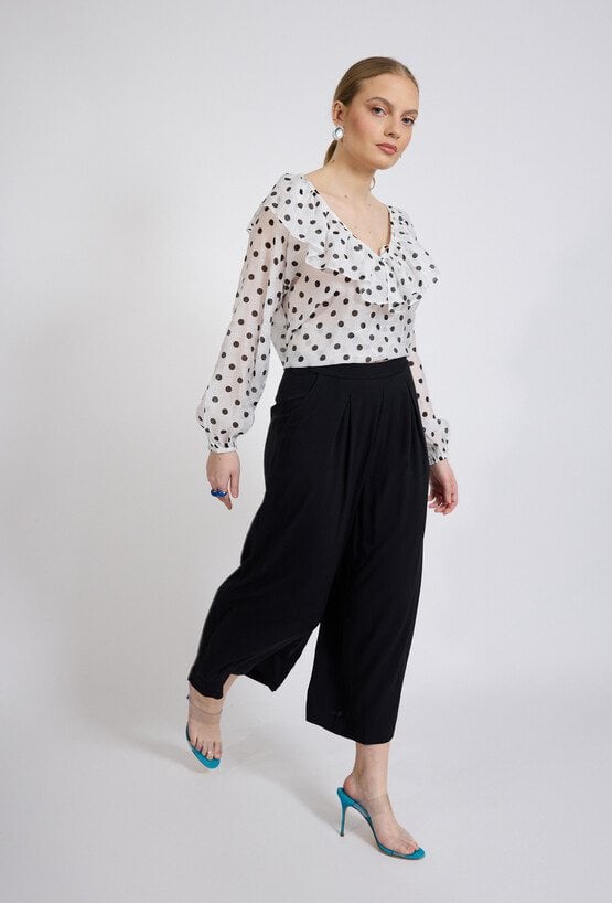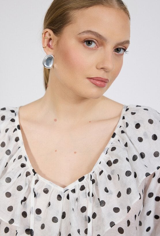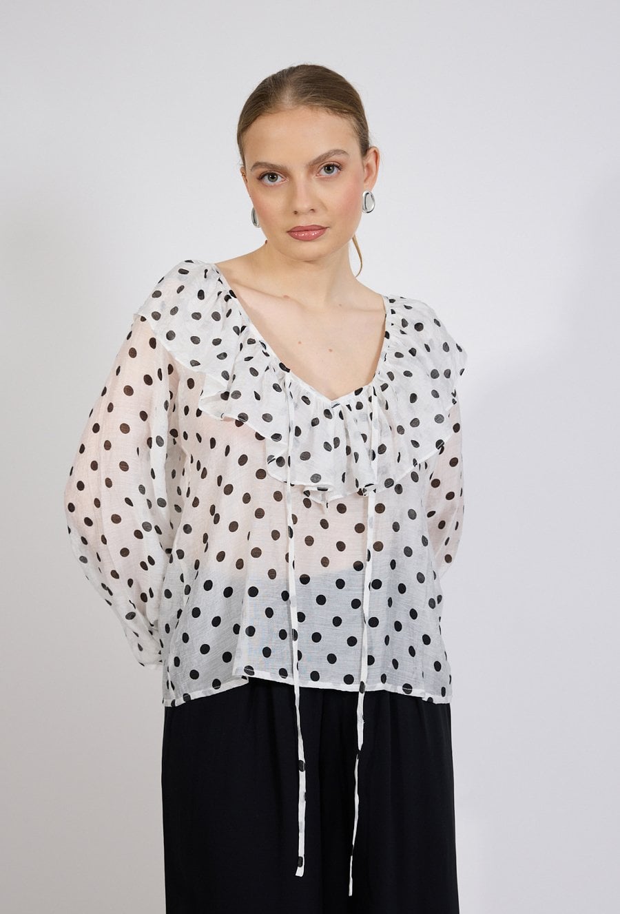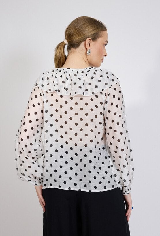 Bluzka damska o lekkim, zwiewnym kroju. Model z długim rękawem zakończonym elastycznym mankietem oraz dekoltem w kształcie litery V z dekoracyjnym wiązaniem. Bluzka damska w kropki doskonale sprawdzi się w codziennych oraz bardziej eleganckich stylizacjach. Modelka na zdjęciu ma 177 cm wzrostu i prezentuje rozmiar 36.