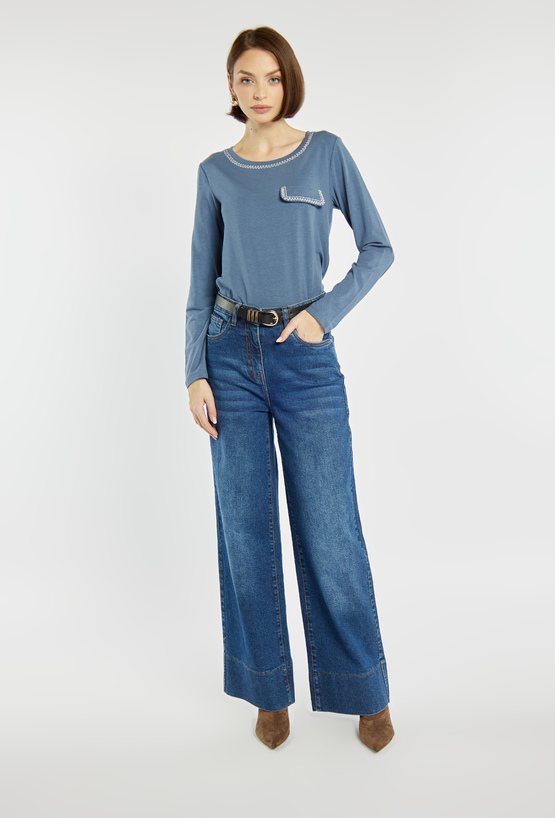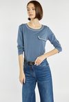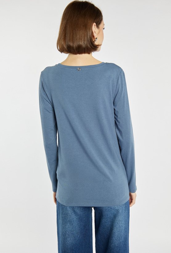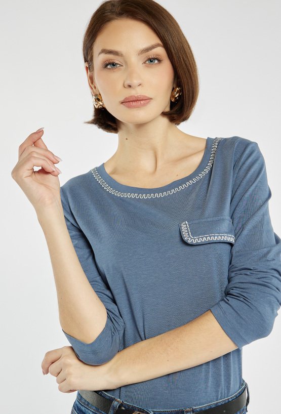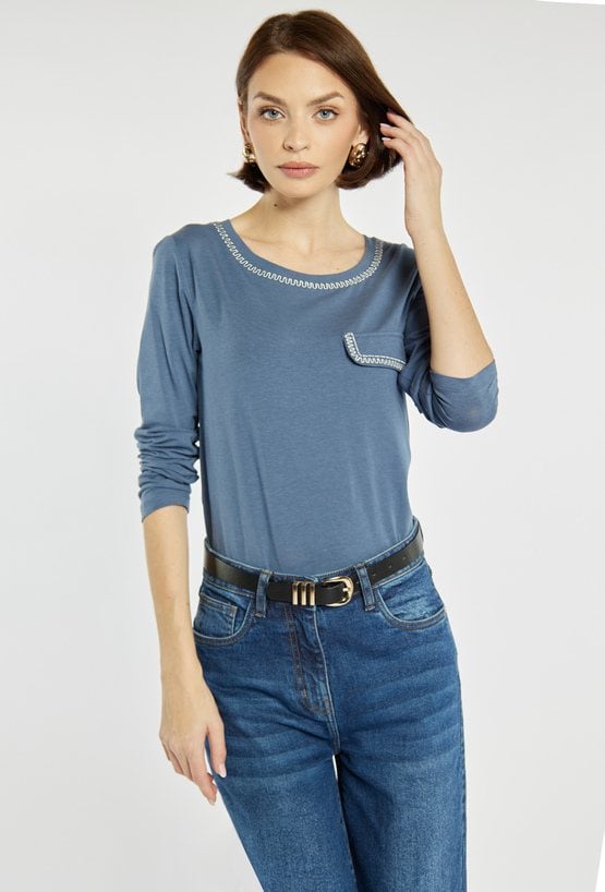 Bluzka z długim rękawem o klasycznym kroju, subtelnie ozdobiona błyszczącymi cyrkoniami przy dekolcie i na patce imitującej kieszonkę. Modelka na zdjęciu ma 177 cm wzrostu i prezentuje rozmiar S.