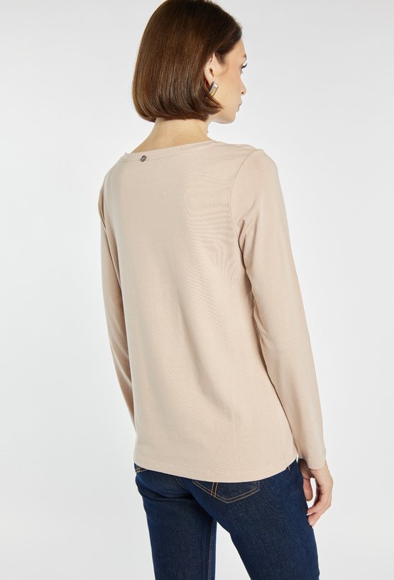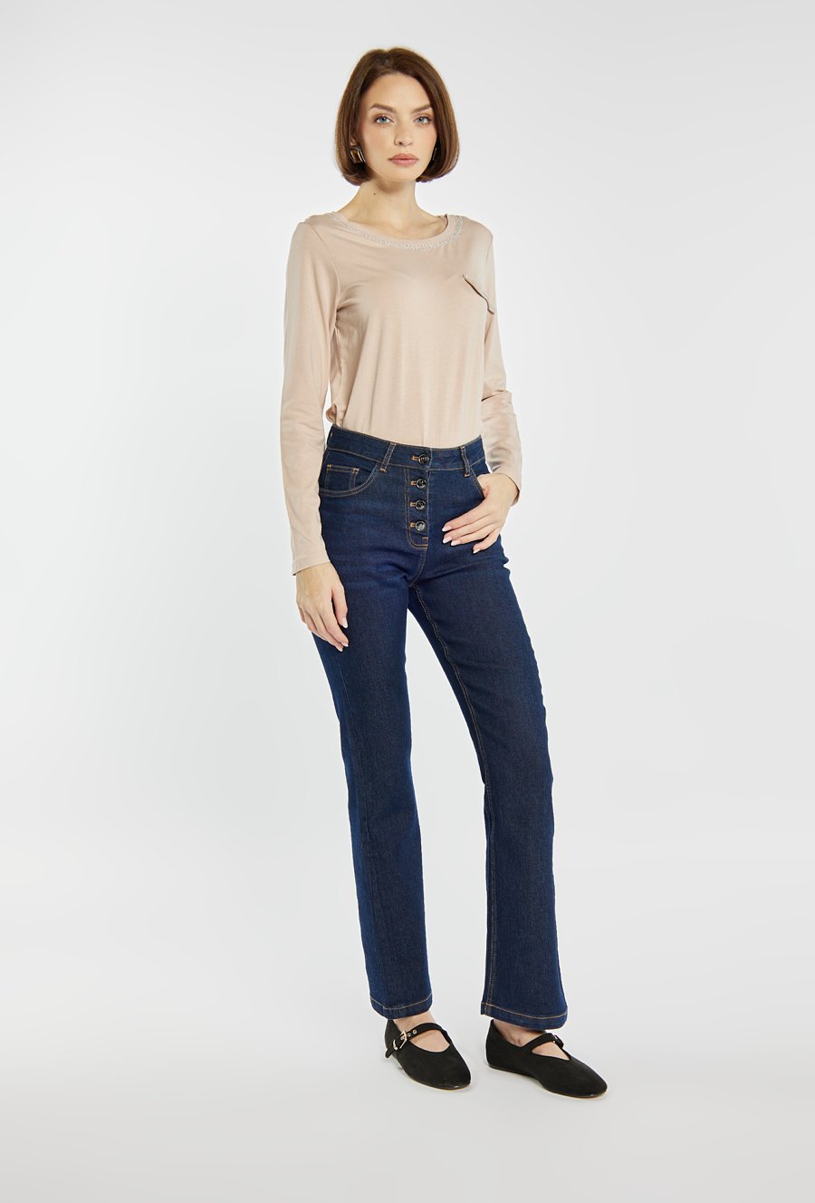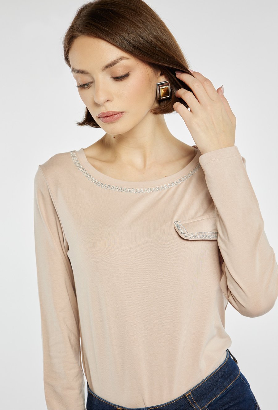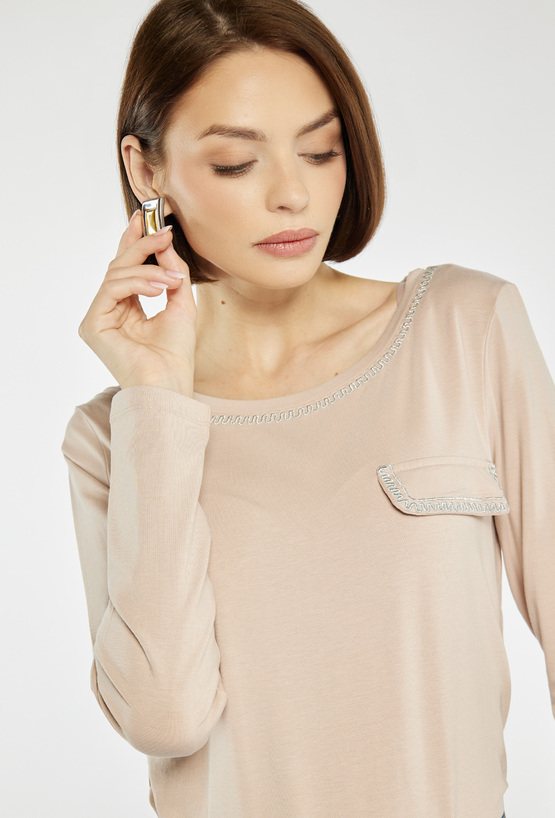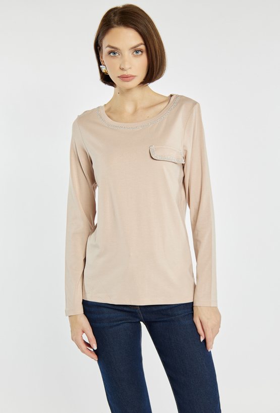 Bluzka z długim rękawem o klasycznym kroju, subtelnie ozdobiona błyszczącymi cyrkoniami przy dekolcie i na patce imitującej kieszonkę. Modelka na zdjęciu ma 177 cm wzrostu i prezentuje rozmiar S.