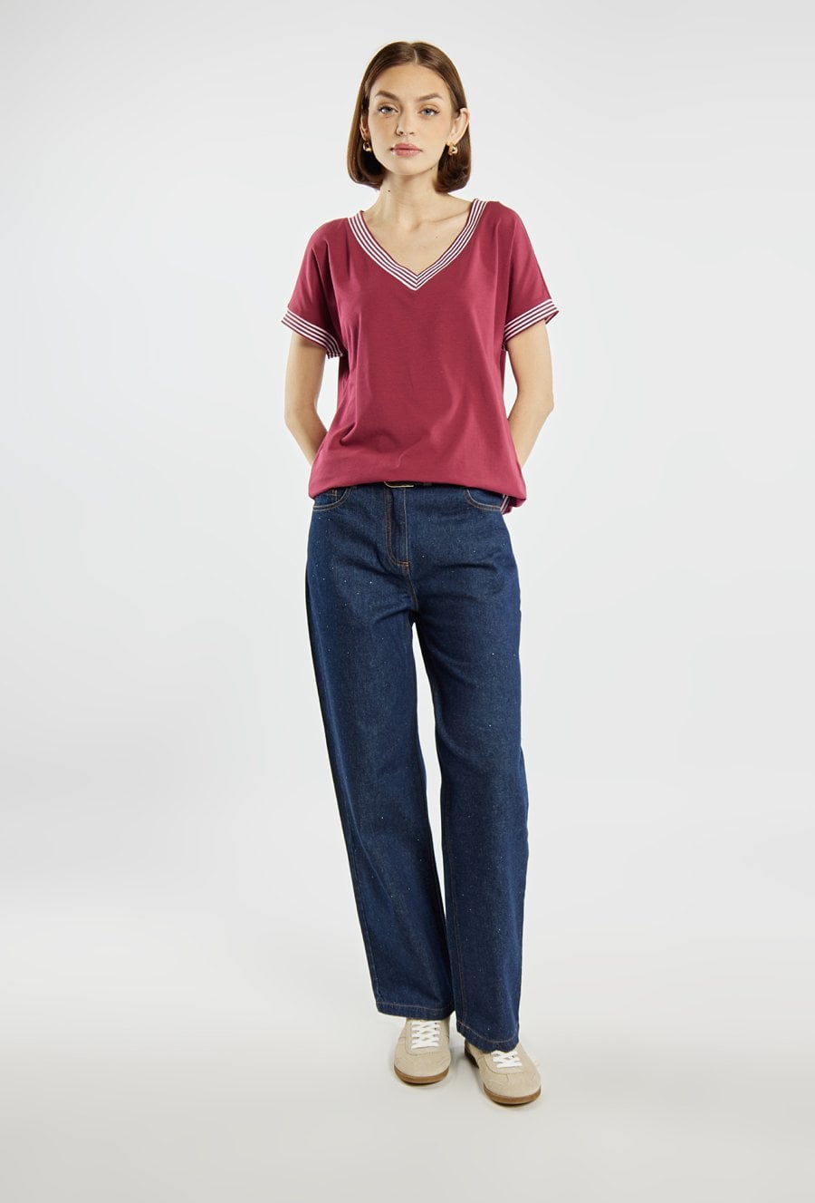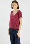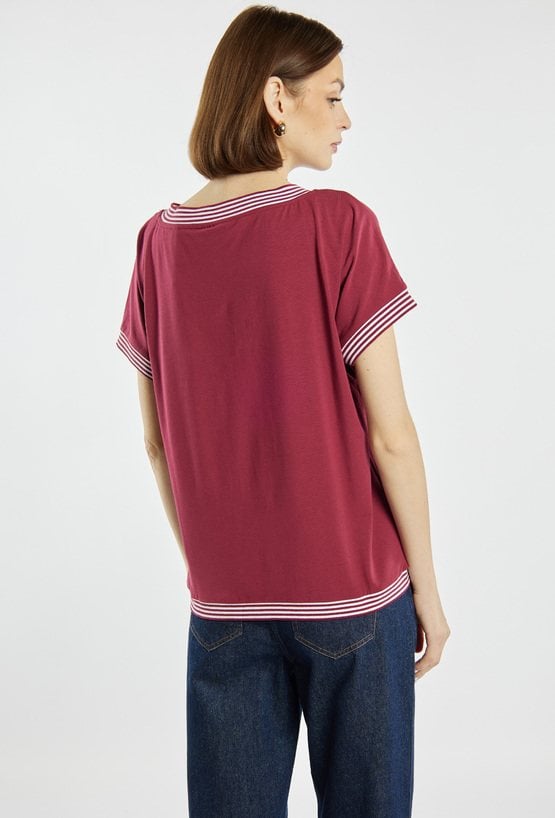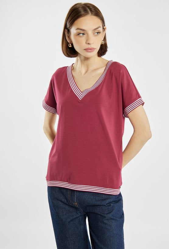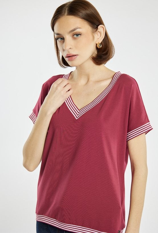 Bluzka damska o swobodnym fasonie. Bluzka z dekoltem w serek, wykończonym kontrastową lamówką, oraz krótkimi rękawami z ozdobnym obszyciem. Klasyczny krój sprawia, że bluzka doskonale sprawdzi się w codziennych. Modelka na zdjęciu ma 177 cm wzrostu i prezentuje rozmiar S.
